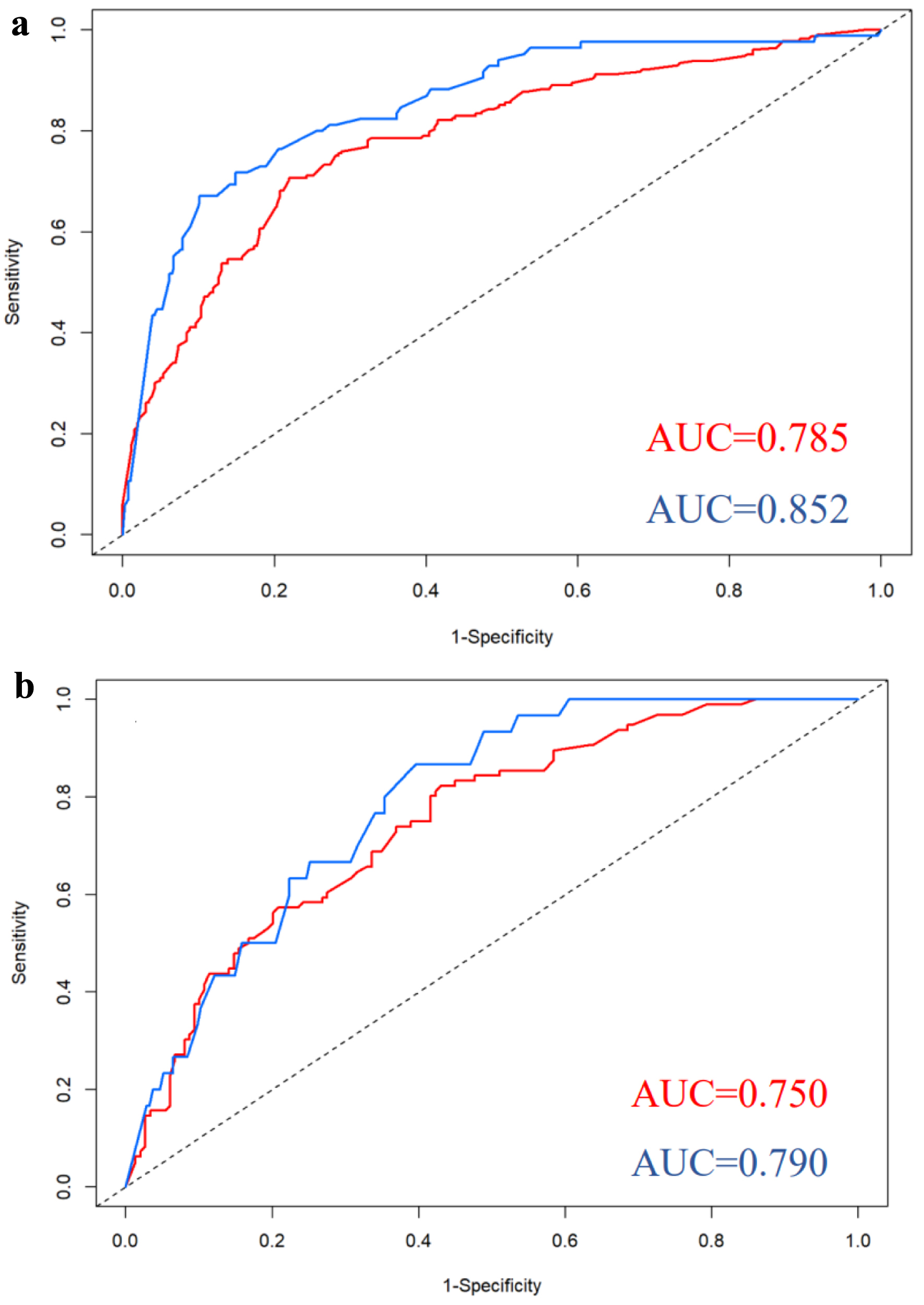![]() Click for large image | Figure 2. ROC curves for nomograms predicting ECE and SVI in the primary cohort (a) and validation cohort (b). Red curves for ECE; blue curves for SVI. AUC: area under curve; ECE: extracapsular extension; ROC: receiver operating characteristic; SVI: seminal vesicle invasion. |