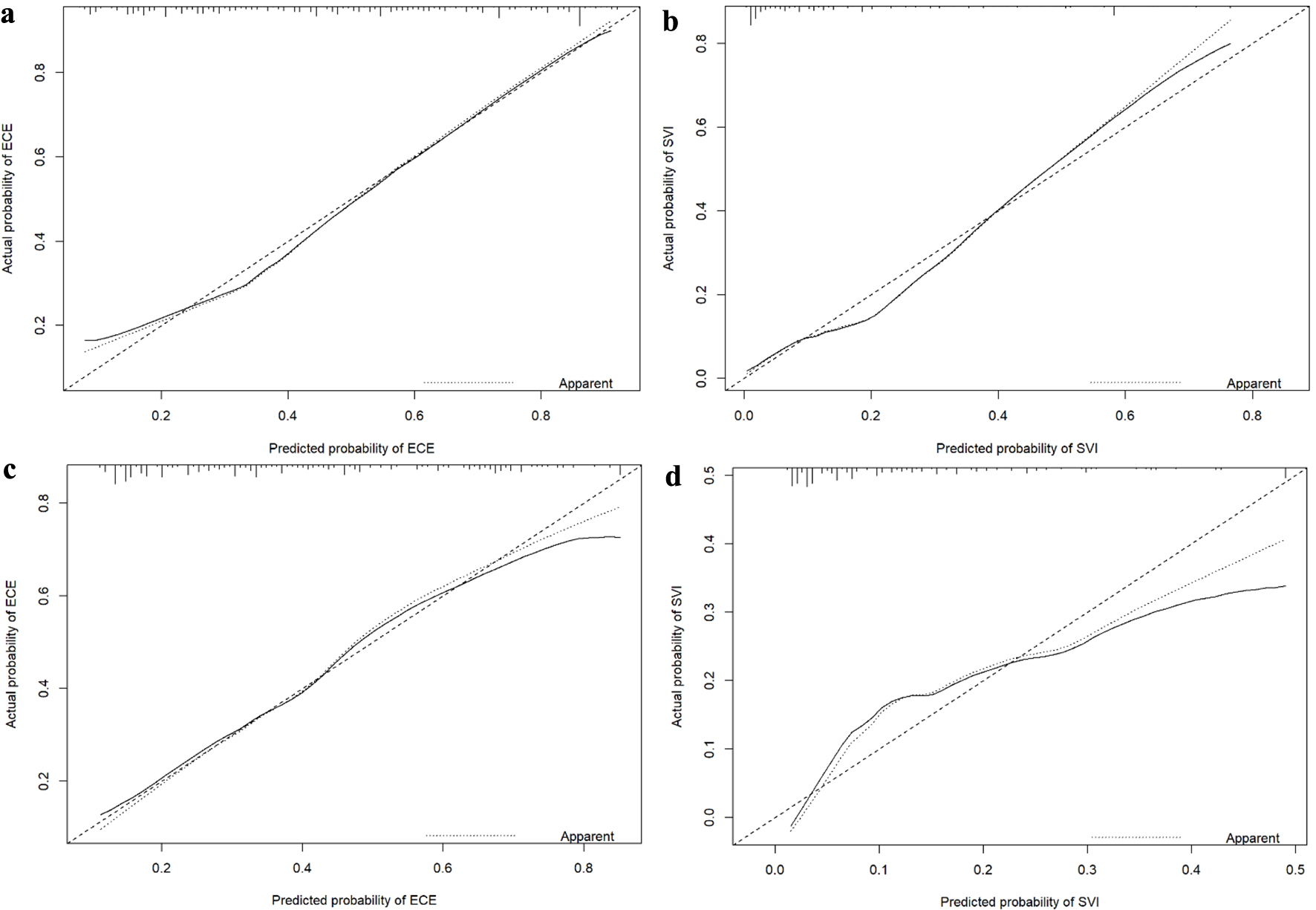We conducted external validation of the created nomograms in a separate validation cohort. The nomogram for predicting ECE achieved a C-index of 0.750 (95% CI: 0.689 - 0.811), indicating a moderate level of discrimination. In comparison, the nomogram for predicting SVI achieved a slightly higher C-index of 0.790 (95% CI: 0.719 - 0.861), suggesting a slightly better discriminatory ability than the ECE prediction. The corresponding AUC of ROC curves, as shown in Figure 2b, further supported the predictive performance of the nomograms. The ROC curves demonstrated that the nomograms exhibited strong discriminatory power for both ECE and SVI. Furthermore, the calibration curves for nomograms predicting ECE and SVI also displayed great agreement between the predicted probabilities by the nomogram and the actual observations in the validation cohort, as depicted in Figure 3c, d.