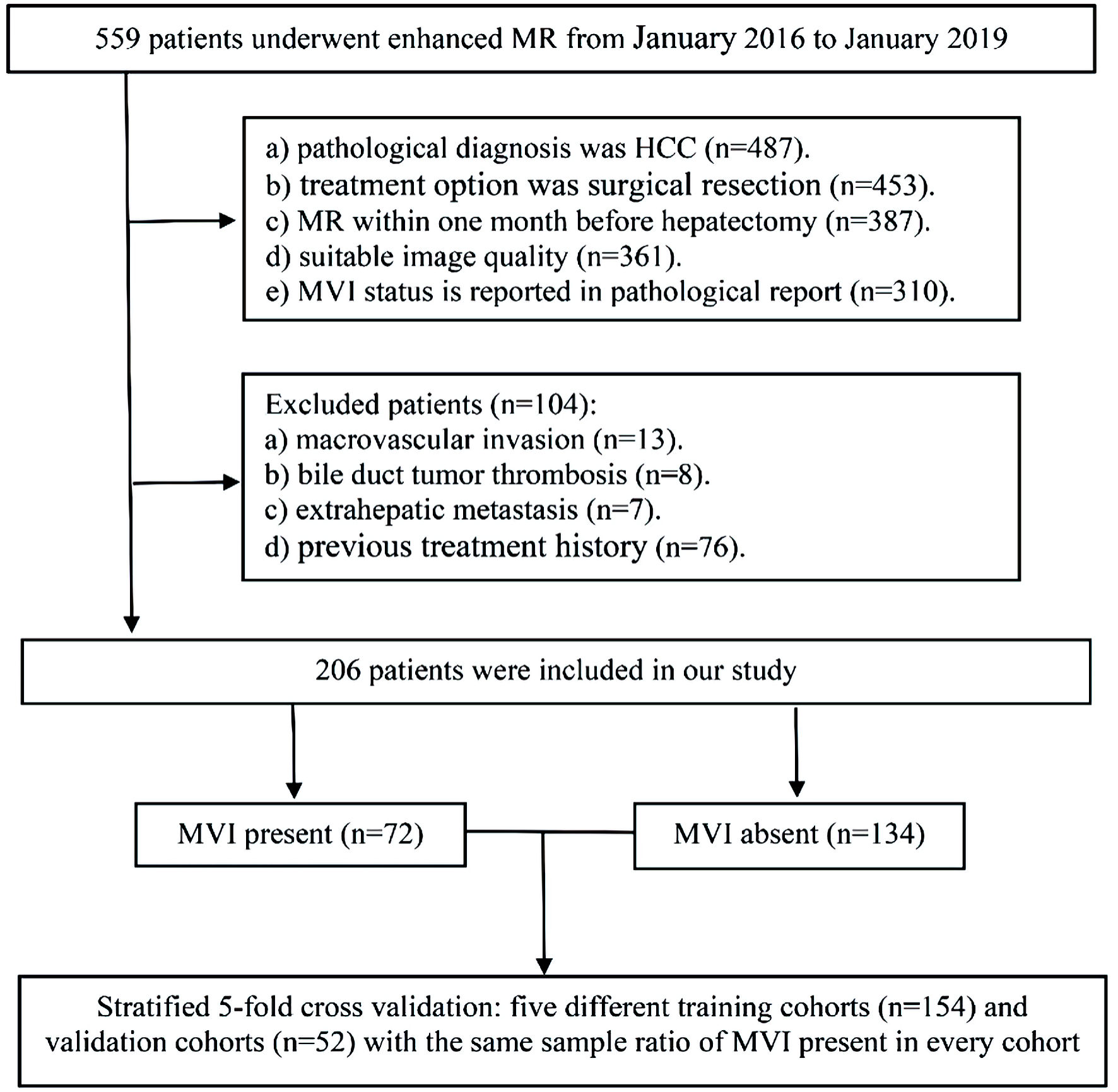 A total of 559 patients who underwent preoperative enhanced magnetic resonance (MR) for liver examination from January 2016 to January 2019 were searched in the hospital workstation. Totally, 206 primary HCC patients were finally recruited into this research (mean age: 55.19 ± 10.69 years, 34 women and 172 men). The inclusion criteria were as follows: 1) The pathological diagnosis was HCC, and the treatment option was surgical resection; 2) Enhanced MR within 1 month before hepatectomy and with suitable image quality; 3) MVI status is reported in pathological report; 4) The preoperative imaging examination and postoperative pathological results showed that there was no macrovascular invasion, no bile duct tumor thrombosis or extrahepatic metastasis; 5) Without previous treatment history, such as local ablation, partial hepatectomy, radiotherapy, chemotherapy or transarterial chemoembolization. The inclusion flow chart of the study patient is shown in Figure 1.