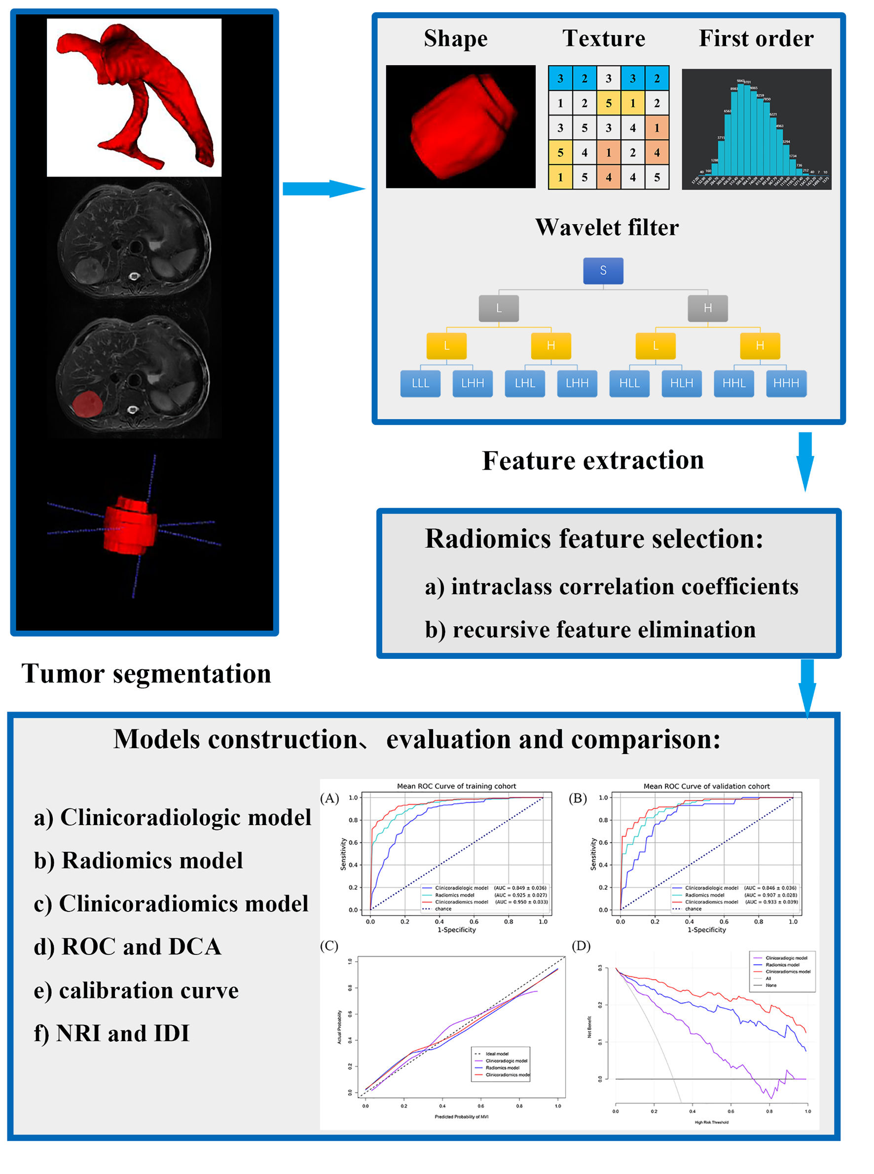 MVI: microvascular invasion; HCC: hepatocellular carcinoma; RFE: recursive feature elimination; NRI: net reclassification improvement; IDI: integrated discrimination improvement; AFP: alpha-fetoprotein; AUC: area under the receiver operating curve; DCA: decision curve analysis; MRI: magnetic resonance imaging; Gd-DTPA: gadopentetate dimeglumine; AP: arterial phase; PP: portal phase; DP: delayed phase T1WI, T1-weighted imaging; T2WI: T2-weighted imaging; DWI: diffusion-weighted imaging; APHE: arterial phase hyperenhancement; ICC: intraclass correlation coefficients; GLCM: gray level co-occurrence matrix; GLRLM: gray level run length matrix; GLSZM: gray level size zone matrix; GLDM: gray level dependence matrix; ROC: receiver operating characteristic; ROI: region of interest