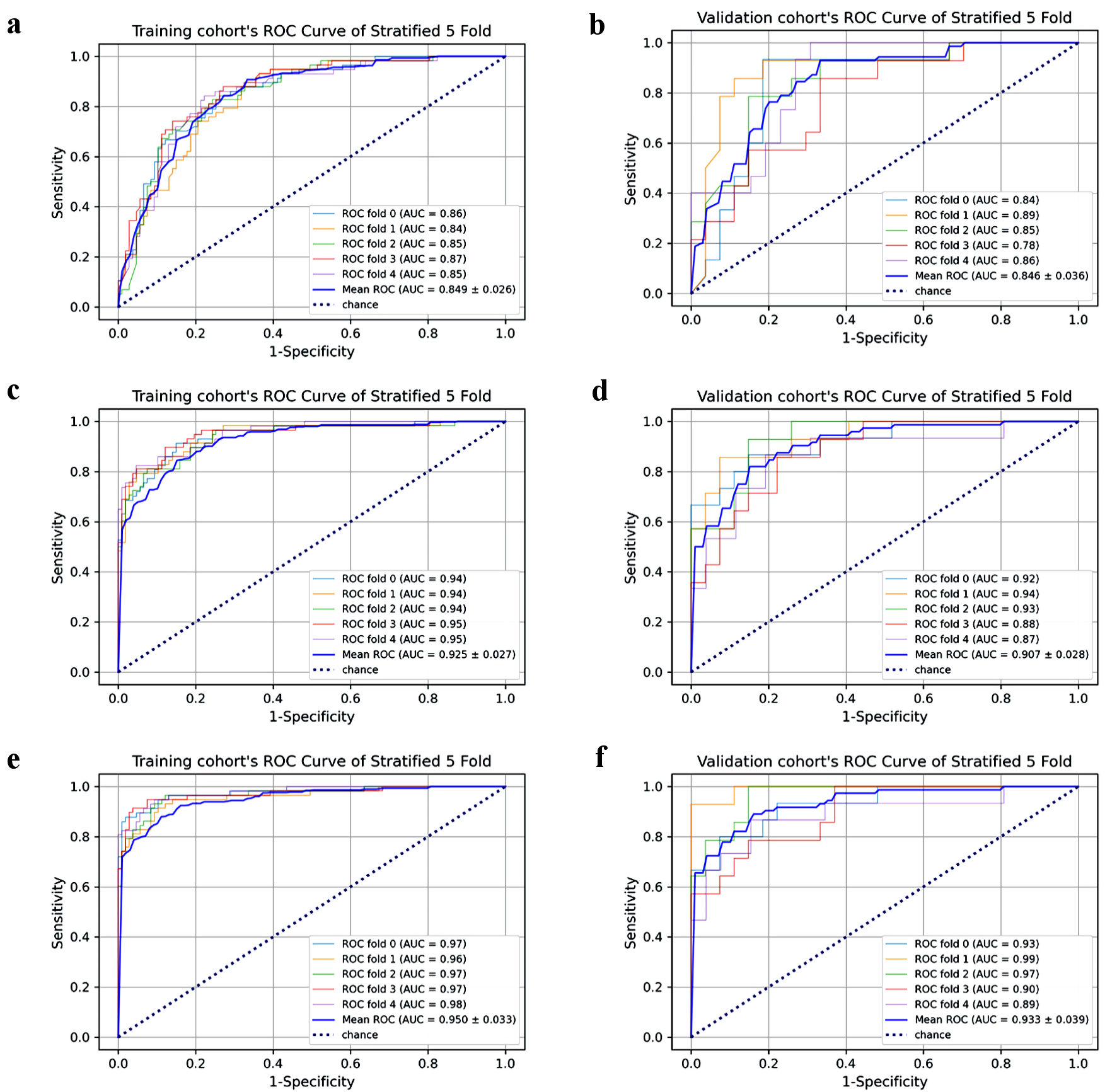 ![]() Click for large image | Figure 3. Each fold cross-validation’s AUC and mean AUC in training/validation cohort of the three models. Clinicoradiological model’s training cohort (a) and validation cohort (b). Radiomics model’s training cohort (c) and validation cohort (d). Clinicoradiomics model’s training cohort (e) and validation cohort (f). AUC: area under the receiver operating curve; ROC: receiver operating characteristic. |