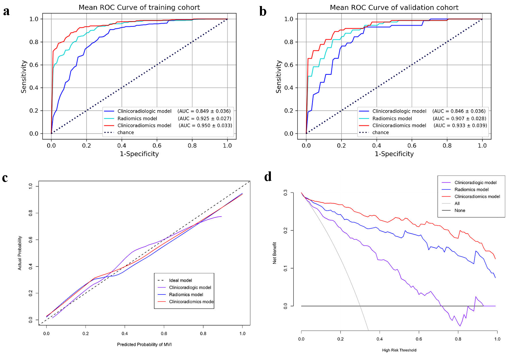 ![]() Click for large image | Figure 4. The three models’ mean ROC curves of training cohort (a) and validation cohort (b). Calibration curves (c) and DCA curves (d) of three models for predicting MVI of HCC. AUC: area under the receiver operating curve; ROC: receiver operating characteristic; DCA: decision curve analysis; MVI: microvascular invasion; HCC: hepatocellular carcinoma. |