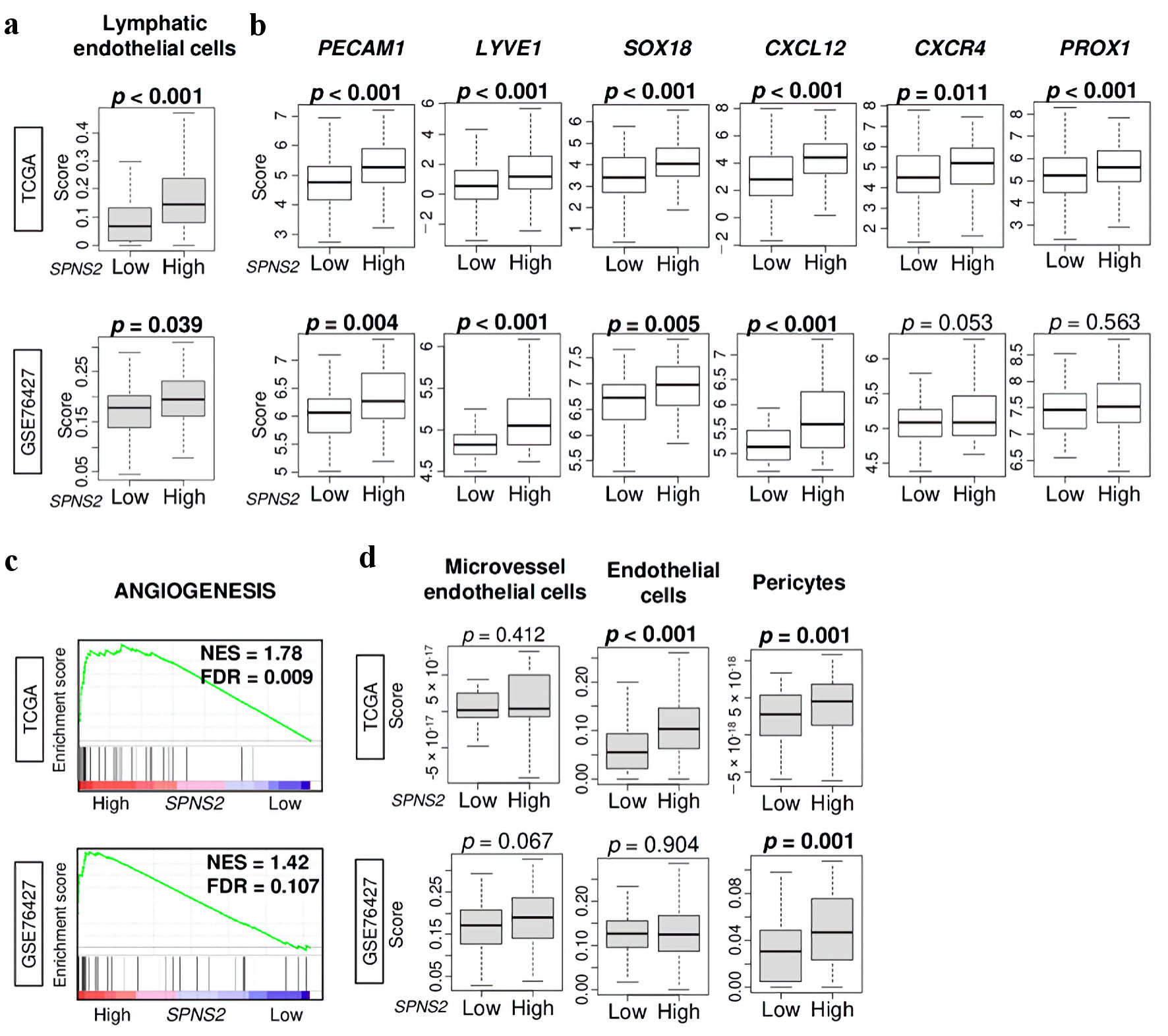 We first investigated whether SPNS2 expression in HCC tumors is associated with lymphangiogenesis-related gene expression. We found that SPNS2-high HCCs were significantly infiltrated by lymphatic endothelial cells (estimated using xCell algorithm) in both the TCGA (P < 0.01) and GSE76427 cohorts (P = 0.046) (Fig. 1a). Several markers of lymphangiogenesis (platelet endothelial cell adhesion molecule (PECAM)1, LYVE1, SOX 18, chemokine (C-X-C motif) ligand (CXCL)12, chemokine (C-X-C motif) receptor (CXCR)4, Prospero homeobox (PROX)1), were significantly upregulated in SPNS2-high tumors in both cohorts (all P < 0.006, except for CXCR4 and PROX1 in GSE76427) (Fig. 1b). We then conducted GSEA comparing high vs. low expression of SPNS2 in TCGA and GSE76427 cohorts and found that high expression of SPNS2 significantly enriched angiogenesis-related gene sets (Fig. 1c). Despite this gene set enrichment, SPNS2-high HCCs showed a significant infiltration of pericytes, and not microvascular endothelial cells, or endothelial cells (Fig. 1d).