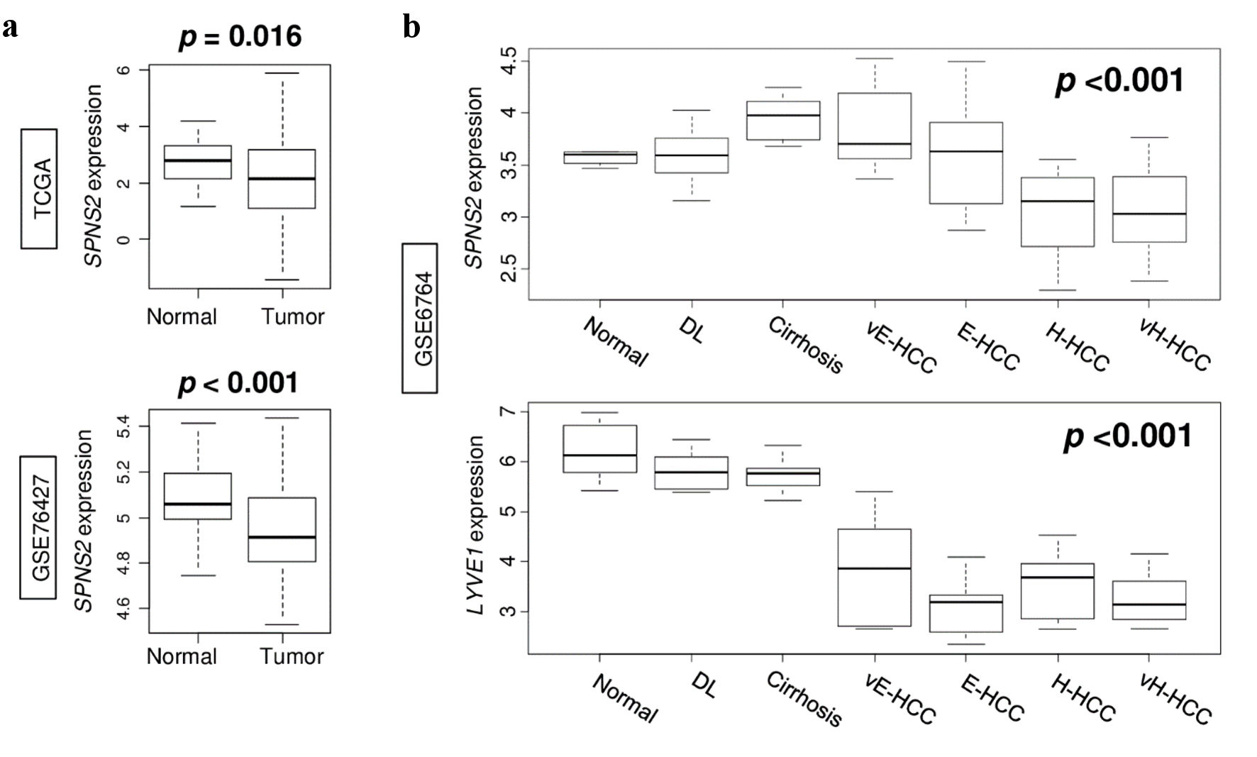 ![]() Click for large image | Figure 2. Gene expression in the spectrum of normal liver tissue to very advanced HCC. (a) SPNS2 expression in normal tissue compared to HCC tumors in TCGA and GSE76427 cohorts. (b) Expression of SPNS2 and lymphangiogenesis-related gene LYVE1 in GSE6764 cohort. vE-HCC: very early HCC; E-HCC: early HCC; H-HCC: advanced HCC; vH-HCC: very advanced HCC; HCC: hepatocellular carcinoma; TCGA: The Cancer Genome Atlas; SPNS2: spinster homologue 2; DL: dysplasia. |