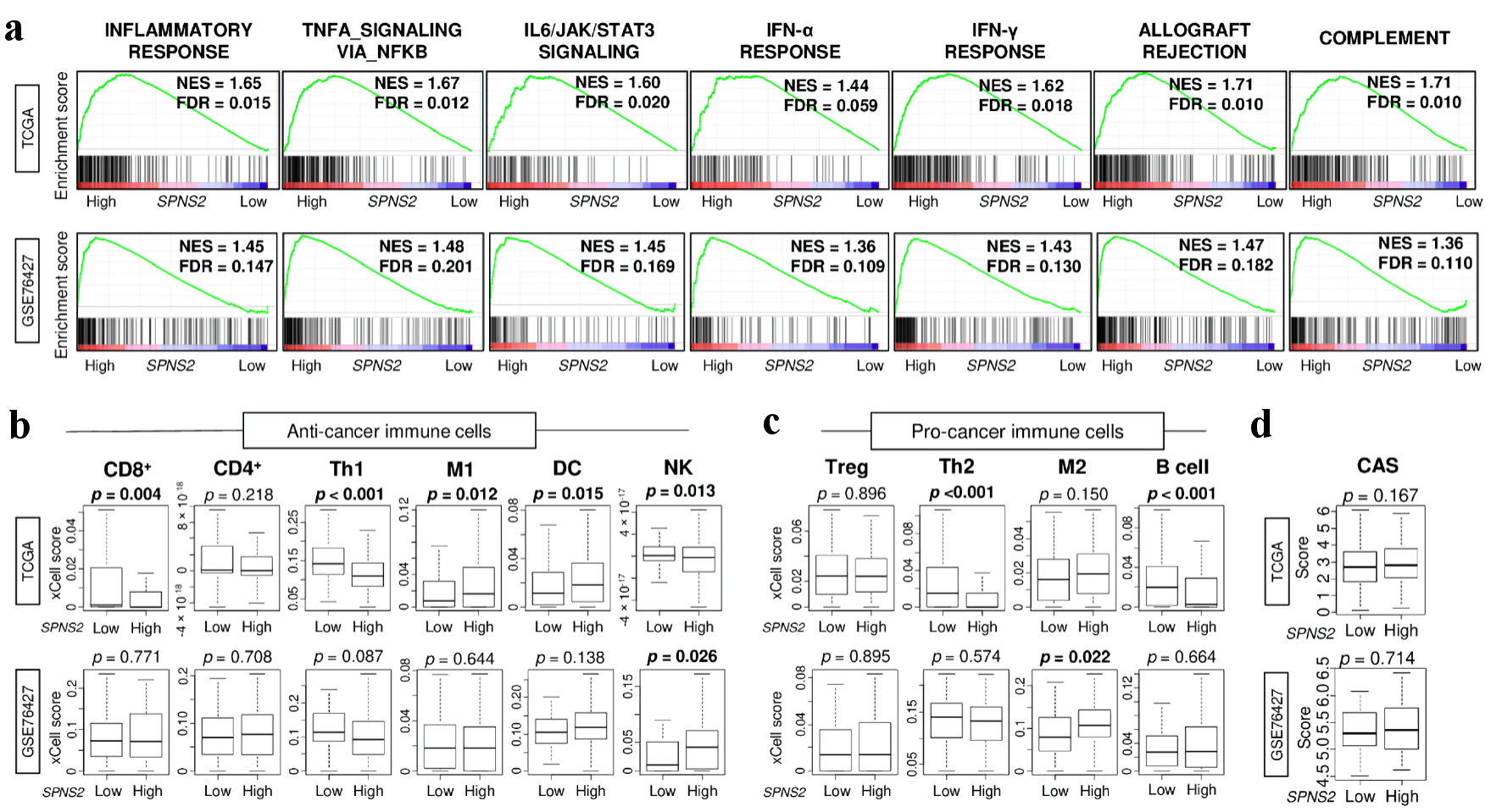 Given the unexpected finding that SPNS2 expression was lower in HCC tumors compared to normal liver tissue, we conducted GSEA comparing high vs. low SPNS2 expression in HCC of TCGA and GSE76427 cohorts. We found that high SPNS2-expressing in HCC significantly enriched inflammation and immune response-related gene sets including inflammatory response, tumor necrosis factor (TNF)-α signaling, interleukin (IL)-6 signaling, interferon (IFN)-α response, IFN-γ response, allograft rejection, and complement (Fig. 3a). However, this did not translate to an increased host immune cell infiltration in the TME by xCell algorithm. SPNS2-high HCC did not demonstrate significant infiltration of lymphocytes or myeloid-derived immune cells (Fig. 3b), as would have been expected based on the GSEA. Furthermore, there was no consistent infiltration of pro-cancer immune cells such as regulatory T cells or M2 macrophages (Fig. 3c). There was no difference in overall cytolytic activity score (CAS) by SPNS2 expression (Fig. 3d).