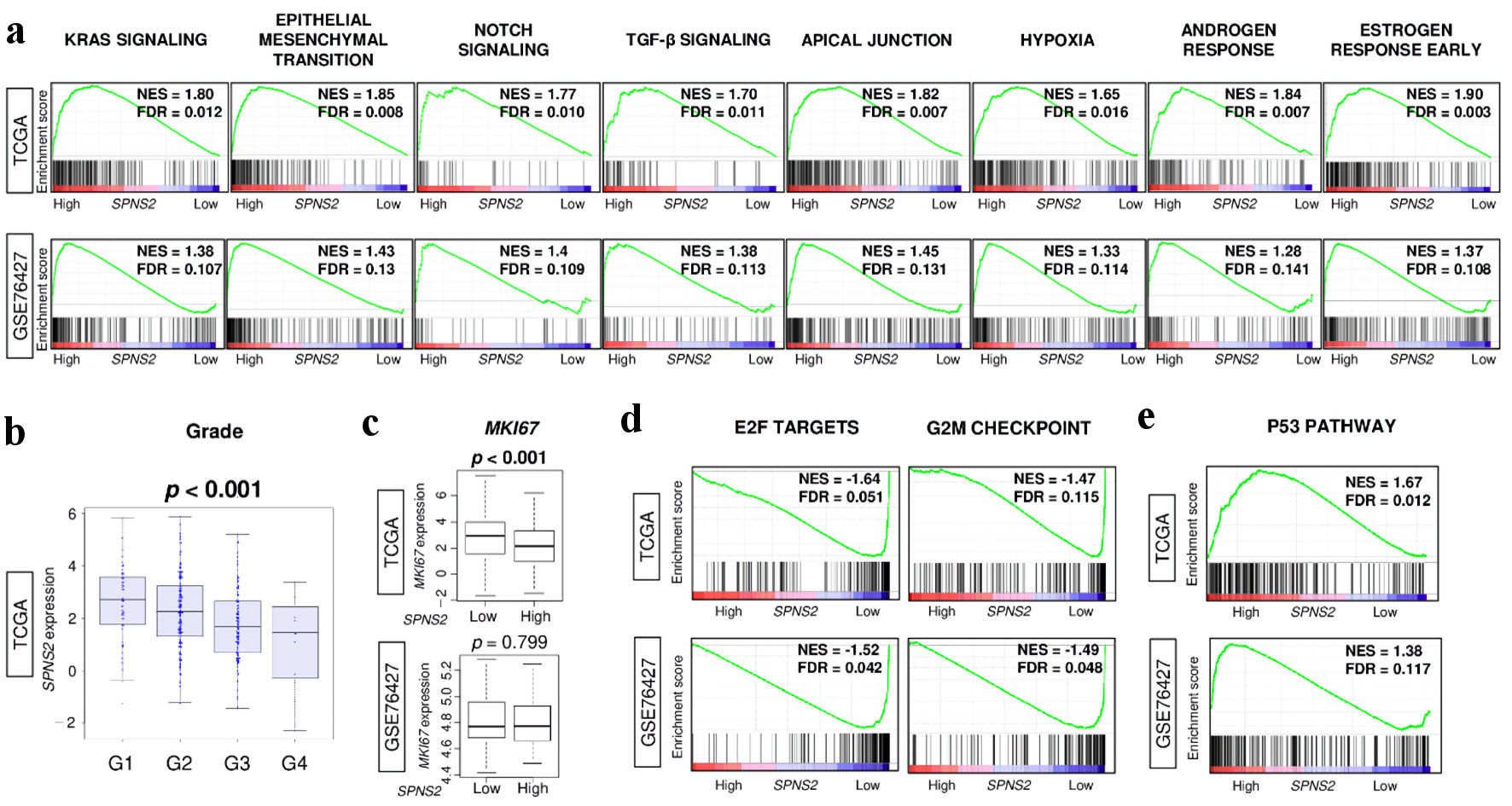 However, this did not translate to cancer cell proliferation. We found that SPNS2 expression actually negatively correlated with tumor grade in TCGA cohort (P < 0.001) (Fig. 4b). Additionally, HCCs with high SPNS2 expression had lower MKI67 expression (P < 0.001), indicating less cell proliferation (Fig. 4c). In order to investigate this finding further, we conducted GSEA for cell proliferation-related pathways and found that E2F targets and G2M checkpoint were enriched with lower SPNS2 expression, not higher, consistently in both cohorts (FDR < 0.25 for all) (Fig. 4d). Additionally, in conducting GSEA for the tumor suppressing p53 pathway, we found that HCCs with higher expression of SPNS2 enriched the p53 pathway in both cohorts (FDR < 0.25 for both) (Fig. 4e). Thus, although SPNS2 expression correlates with expression of multiple tumor-aggravating pathways, it is actually linked to lower tumor grade and proliferation.