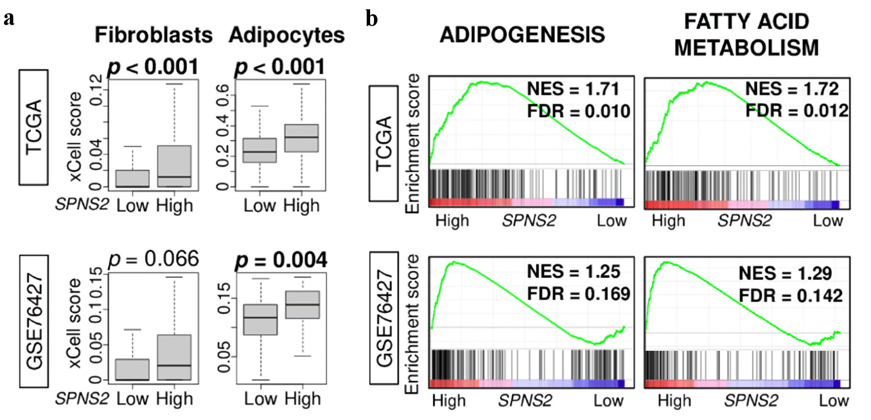 Given the finding that SPNS2 expression was associated with less cell proliferation, we aimed to gain a broader view of the TME by comparing the infiltration of stromal cells in SPNS2-high versus SPNS2-low HCCs using the xCell algorithm. We found that increased SPNS2 expression correlated with a higher infiltration of fibroblasts and adipocytes in the TCGA cohort (P < 0.001), and with adipocyte infiltration in the GSE74627 cohort (P = 0.01) (Fig. 5a). Subsequently, we conducted GSEA of adipogenesis and fatty acid metabolism gene sets comparing high versus low SPNS2 expression and found that they were significantly enriched to SPNS2-high HCC consistently across both TCGA and GSE78427 cohorts (FDR < 0.25) (Fig. 5b). These results show that high SPNS2 expressing HCC patients were associated with increased generation of adipocytes and infiltration of fibroblasts in the TME, which is in agreement with less cancer cell proliferation.