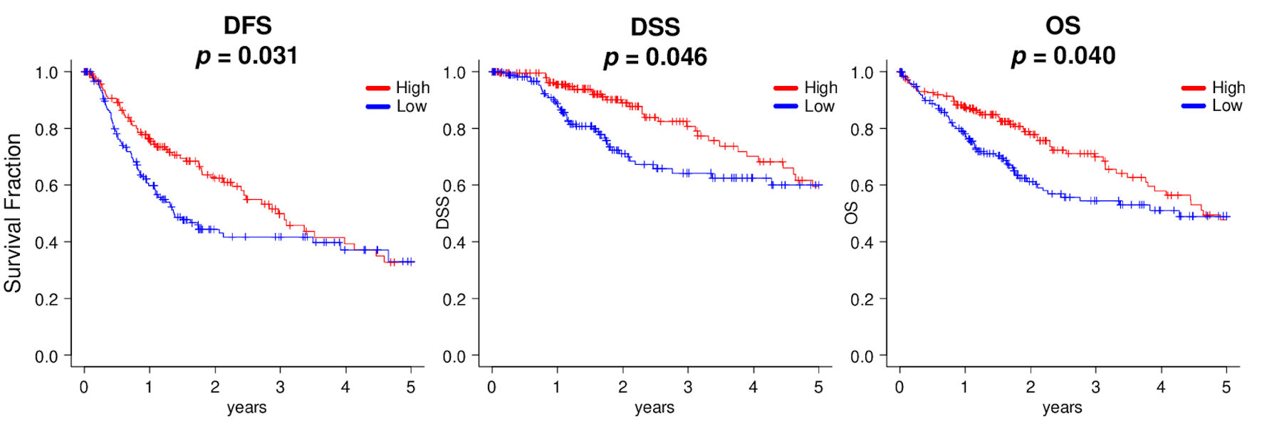 We initially hypothesized that HCC with high expression of SPNS2 would lead to worse survival. Surprisingly, we found that high expression of SPNS2 was associated with significantly better DFS (P = 0.031), disease-specific survival (DSS) (P = 0.046) and overall survival (OS) (P = 0.040) in the TCGA cohort (Fig. 6). This result was validated by Kaplan-Meier Plotter (RNA-seq, n = 364 [43]) that patients with high SPNS2 expression HCC had better OS, hazard ratio (HR) = 0.52 (0.36 - 0.75), log-rank P = 0.00033. On the other hand, although DFS was significantly better in high SPNS2 with log-rank P = 0.042, HR (high) = 0.73, P (HR) = 0.041, n (high) = 182 and n (low) = 182, there was no difference in OS (log-rank P = 0.082, HR (high) = 0.73, P (HR) = 0.083, n (high) = 182 and n (low) = 182) in Gene Expression Profiling Interactive Analysis (GEPIA) [44].