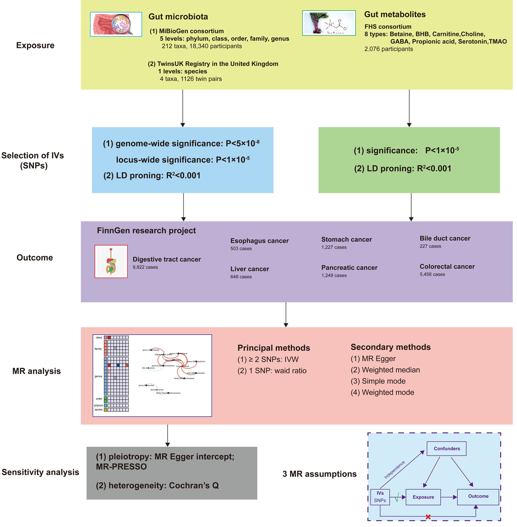The authors thank all investigators and participants from the MiBioGen, TwinsUK Registry and FinnGen research contributing to GWAS of gut microbiota, gut metabolites, and digestive tract cancer.