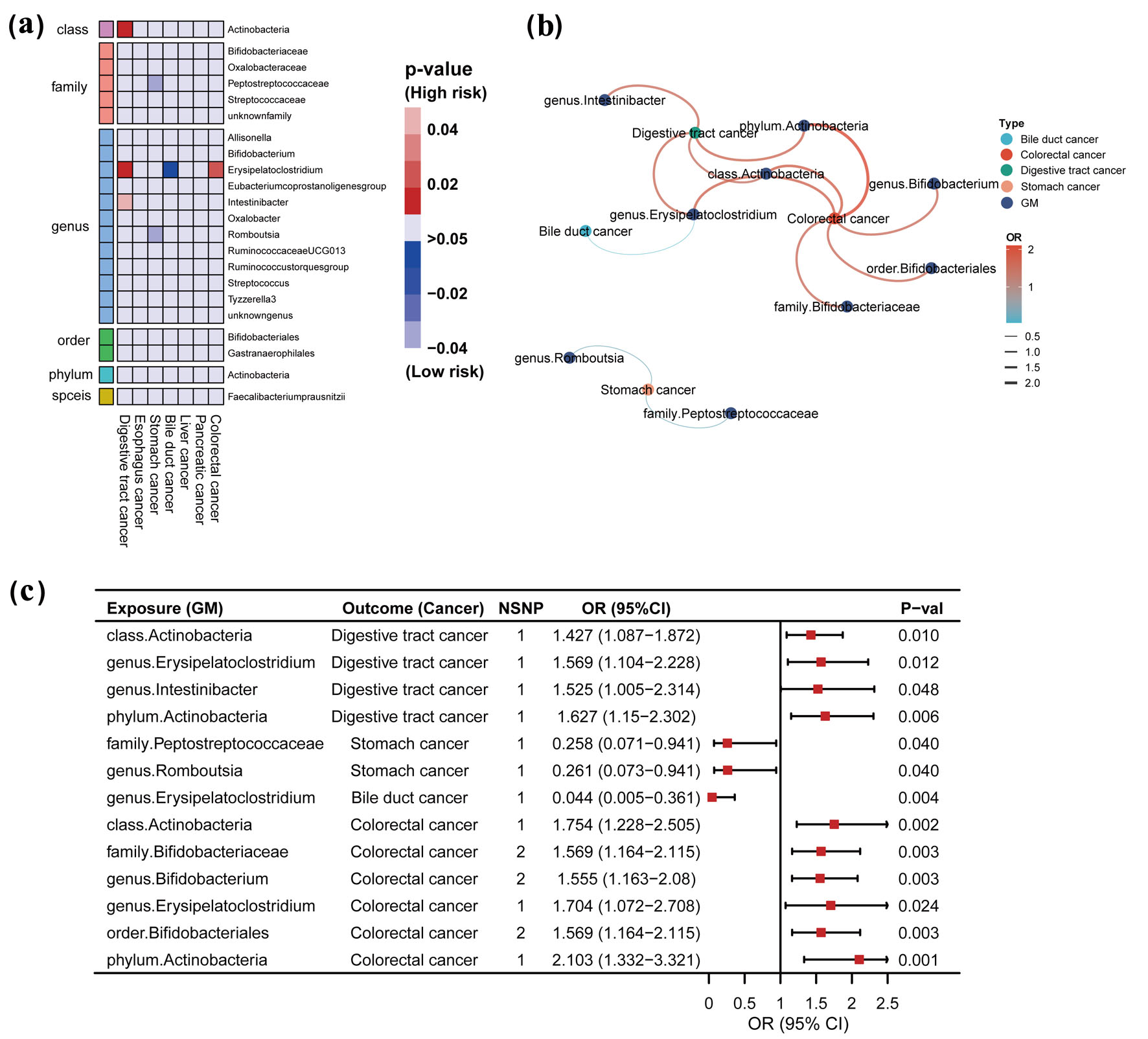 ![]() Click for large image | Figure 2. Causal effects of gut microbiome and digestive tract cancer based on the IVW method (SNPs with P < 5 × 10-8). (a) Heatmap of the P-value. Red color in the heatmap indicates a positive correlation between gut microbiome and digestive tract cancer and blue color indicates a negative correlation. The color depth represents the size of the P-value, with darker colors indicating more significant P-values. (b) Network interactions based on statistically significant ORs. Color and line thickness in the network diagram indicate the OR of gut microbiota and digestive tract cancer. Darker red color and thicker lines indicate higher OR values. (c) Forest plot with statistically significant ORs. OR > 1 indicates the positive correlation between a particular gut microbiota and a particular digestive tract cancer. OR < 1 indicates the negative correlation between the two. IVW: inverse-variance weighted; GM: gut microbiome; SNP: single-nucleotide polymorphism; OR: odds ratio; 95% CI: 95% confidence interval; NSNP: number of SNP. |