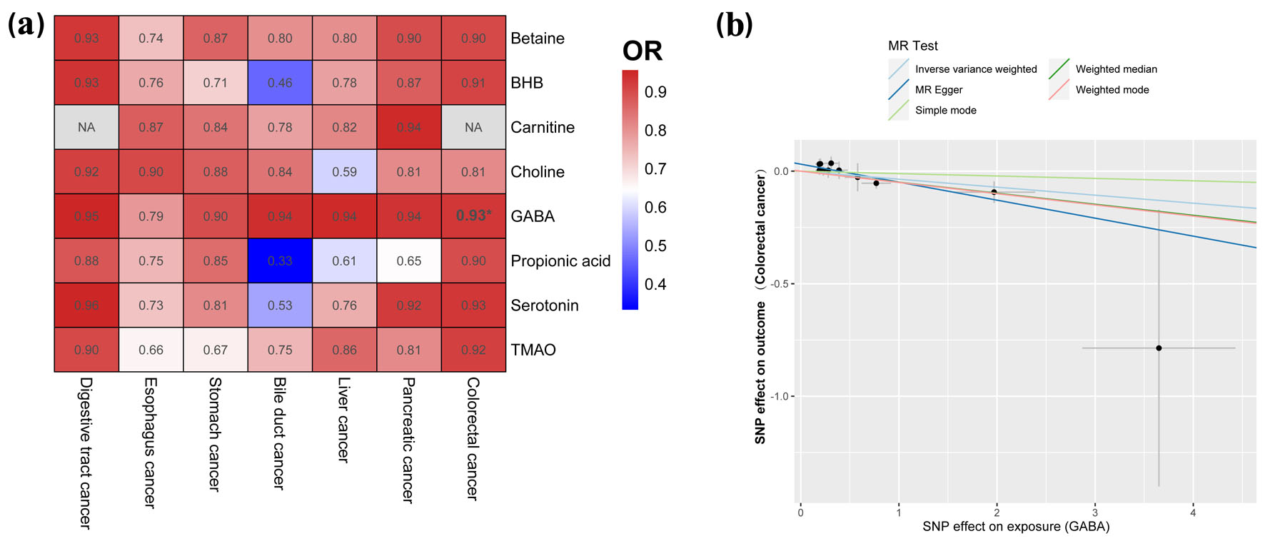 ![]() Click for large image | Figure 3. Causal effects of gut metabolite and digestive tract cancer based on the IVW method (SNPs with P < 1 × 10-5). (a) Heatmap of the ORs. Color in the heatmap indicates the OR of gut metabolite and digestive tract cancer. Darker red color indicates higher OR values. The asterisk indicates statistically significant OR. (b) Correlation between GABA and colorectal cancer. IVW: inverse-variance weighted; SNP: single-nucleotide polymorphism; OR: odds ratio; MR: Mendelian randomization. |