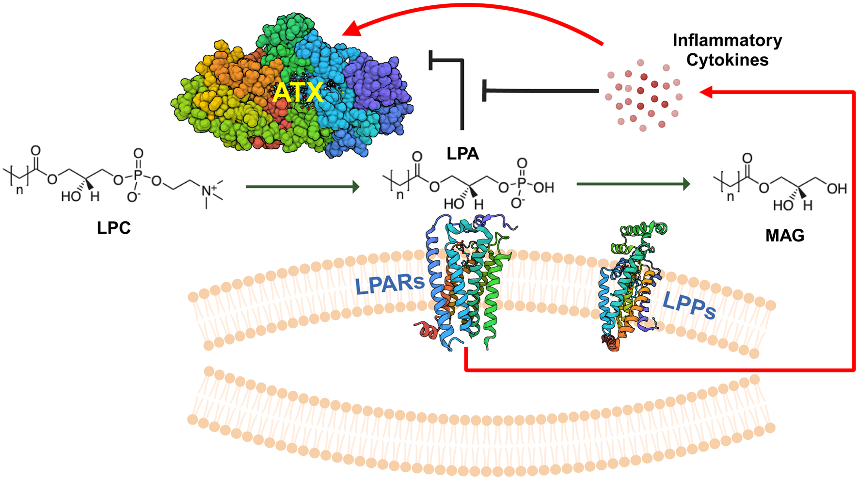 ATX: autotaxin; IPF: idiopathic pulmonary fibrosis; LPA: lysophosphatidate; LPAR: lysophosphatidate receptors; LPC: lysophosphatidylcholine; LPP: lipid phosphate phosphatase; MAG: monoacylglycerol; MMTV: mammary mouse tumor virus