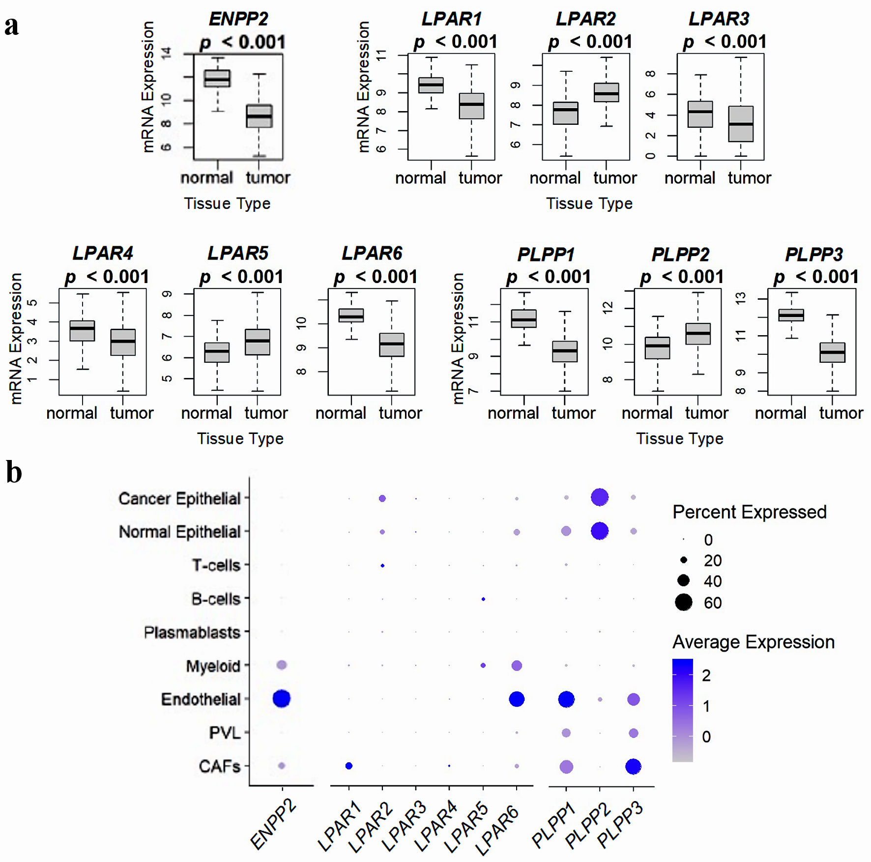 ![]() Click for large image | Figure 2. Comparison of ATX, LPARs, and LPPs expression in normal breast tissue and whole breast tumors, and via breast tumor single cell RNA sequencing. (a) mRNA expression from 114 normal breast tissues and 1,090 whole breast cancer tumors from the TCGA database. Results are plotted as box plots, with the bolded center bar representing the median, the lower and upper bounds the 25th and 75th percentiles, respectively, and the lower and upper tails the minimum and maximum values, respectively. (b) Single-cell RNA sequencing results from the cohort described in [42], comprised of 26 breast tumors (11 ER+ HER2-, five HER2+, and 10 TNBC), for a total of 130,246 single cells, to demonstrate which cell populations in the tumor express these genes. Percent expressed (circle size) refers to the percent of the total gene expression for the whole tumor by cell type, and color refers to the average gene expression. Figures were reproduced from [15, 40, 41] with permission. ATX: autotaxin; LPP: lipid phosphate phosphatase; ER: estrogen receptor; HER: human epidermal growth factor receptor; TNBC: triple-negative breast cancer. |