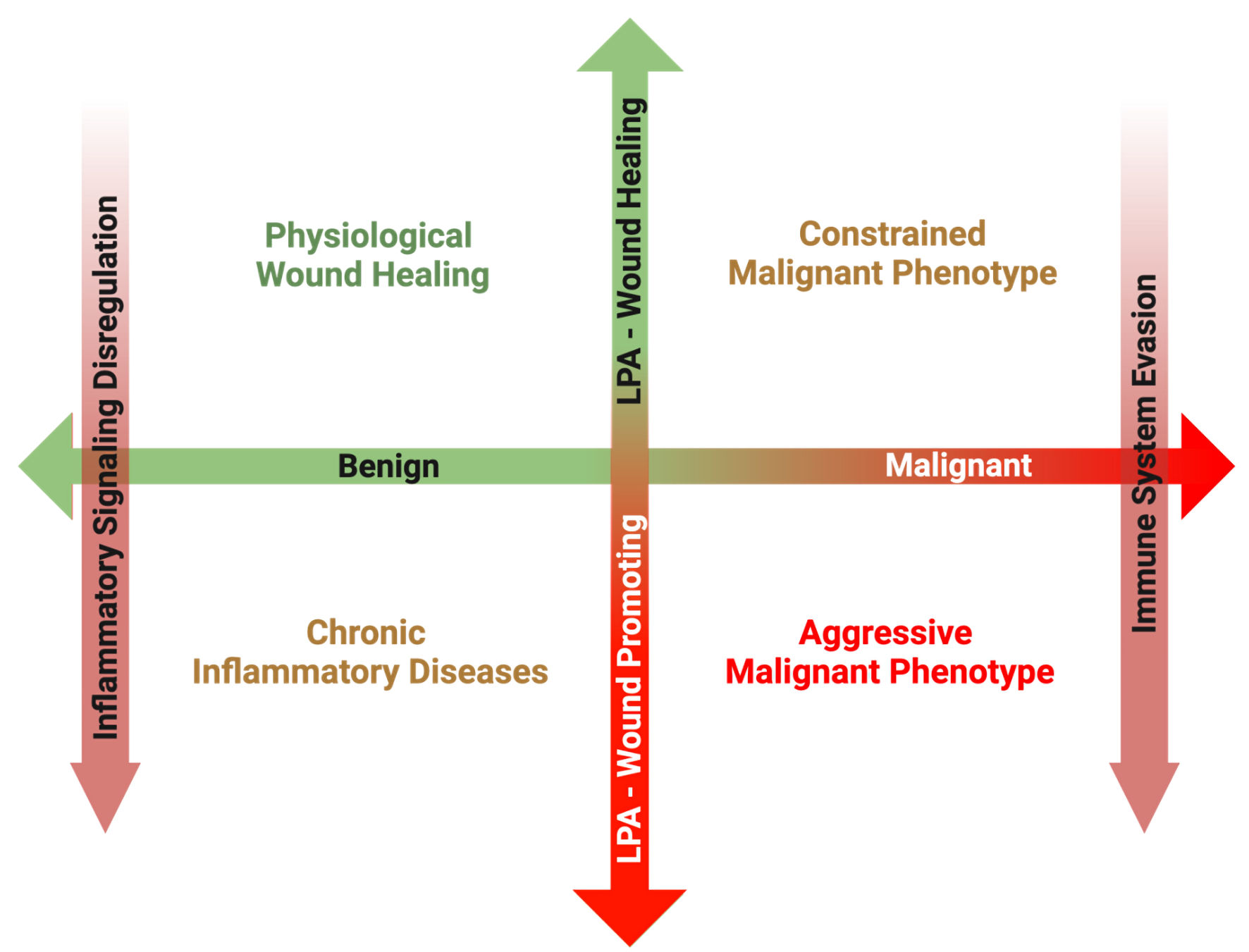 ![]() Click for large image | Figure 3. Overview of the proposed matrix between disease transformation and LPA subversion from a physiological wound healing mediator to a pathological wound promoting ligand. In the post-natal organism, a primary role of LPA signaling is to promote physiological wound healing processes in response to acute inflammation following tissue damage. Once the tissue is repaired, inflammation subsides, and increased LPA signaling is returned to basal levels. However, in the case of chronic inflammatory conditions, inflammatory pathways remain upregulated, resulting in increased ATX production and sustained LPA signaling. Some cancers can arise secondary to the sequalae of chronic inflammation, and in these cases, LPA signaling from tumor initiation perpetuates the chronicity of sustained inflammation, promoting tumorigenesis. However, during the early phases of some cancer initiation, LPA signaling from the surrounding host tissue can attempt to suppress development through its physiological wound healing mechanisms. In some cases, this LPA signaling is hijacked, and through a combination of inflammatory signaling dysfunction and immune system evasion, LPA signaling begins to mediate a pro-growth and pro-survival tumor microenvironment. LPA: lysophosphatidate; ATX: autotaxin. |