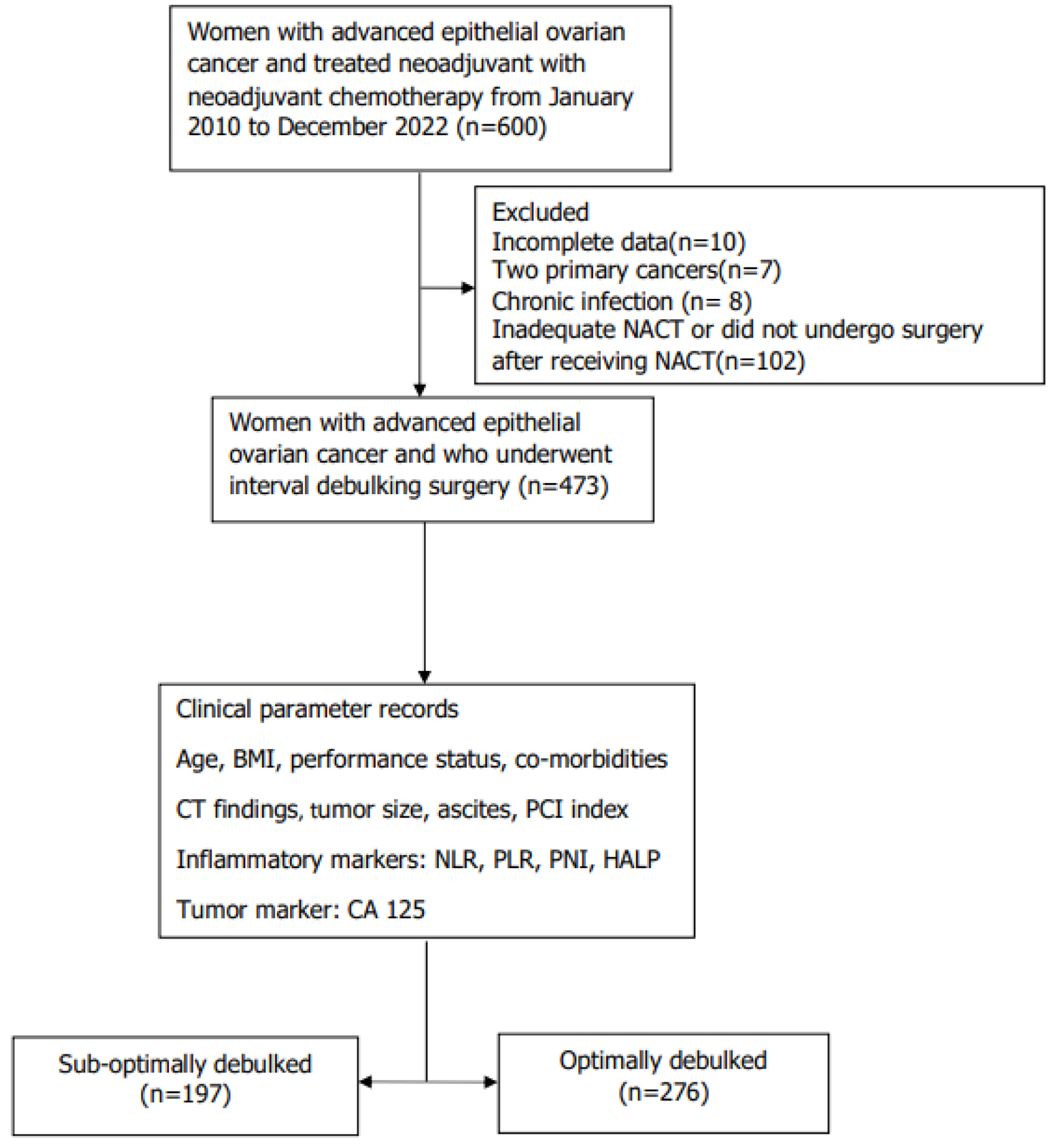 Patients with AEOC were diagnosed by gynecological oncologists and radiologists specializing in ovarian cancer. This study included patients with extensive disease or those unable to tolerate extensive surgery owing to age or comorbidities from January 2010 to December 2022 who met the inclusion criteria for stage IIIC-IVA according to FIGO 2014 classification [16], histological diagnosis, and NACT treatment. The exclusion criteria were two primary cancers: incomplete HALP index data, presence of chronic or acute inflammation or infections affecting prognosis (e.g., patients actively on infection may also experience leukocytosis, human immunodeficiency virus infection), inadequate NACT, or absence of surgery after NACT. The remaining patients formed the derivation cohort for the development of the clinical risk-scoring model. A screening flow diagram of the study is shown in Supplementary Material 1 (www.wjon.org).