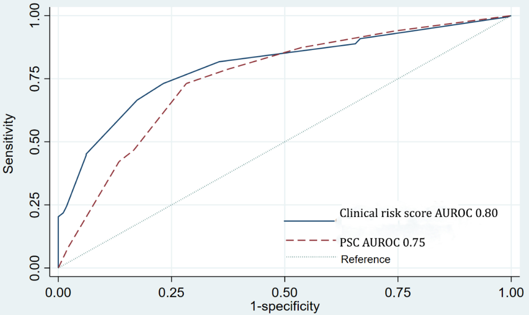 ![]() Click for large image | Figure 2. Comparison of AUROC between new clinical risk score and the PSC score in discriminating suboptimal surgery cases. AUROC: area under the receiver operating characteristic curve; PSC: predictive cytoreduction. |