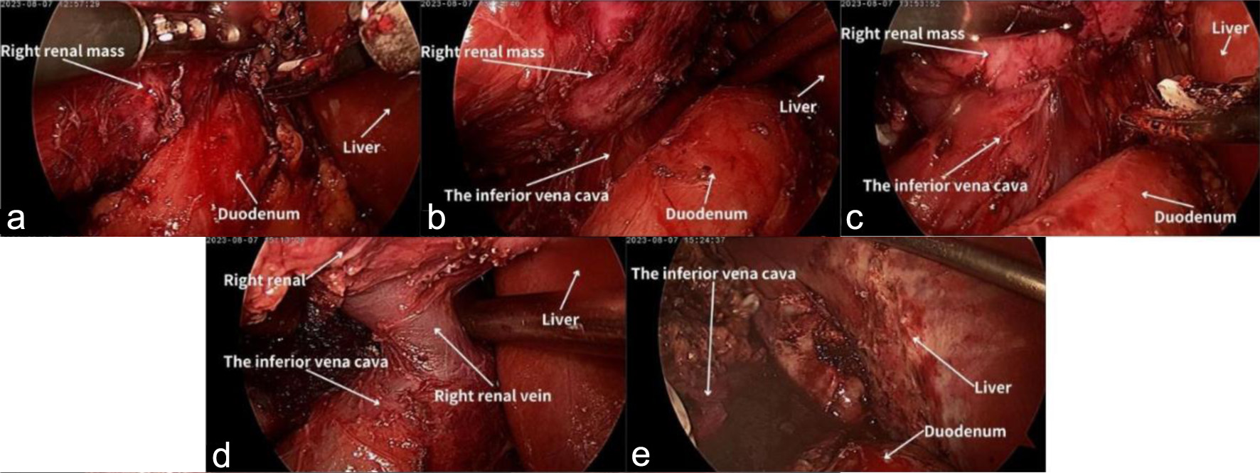 ![]() Click for large image | Figure 2. The radical nephrectomy of the right kidney. (a) Adhesion of the right kidney to the descending portion of the duodenum. (b) The kidney and the duodenum after adhesion were released. (c) Adhesion of the right kidney to the inferior vena cava. (d) The kidney and the inferior vena cava after adhesion were released. (e) The lower lobe of the liver after adhesion was released. |