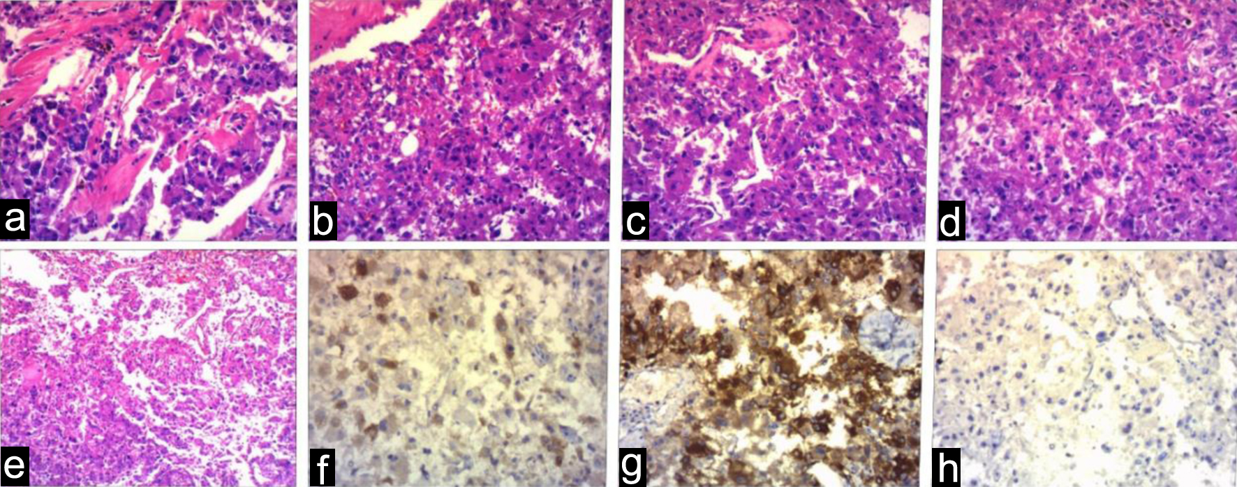 ![]() Click for large image | Figure 3. The histopathology (a-e) and immunohistochemistry (f-h) of the right renal mass. (f) HMB45 positive, (g) melan-A positive, (h) TFE3 negative. |