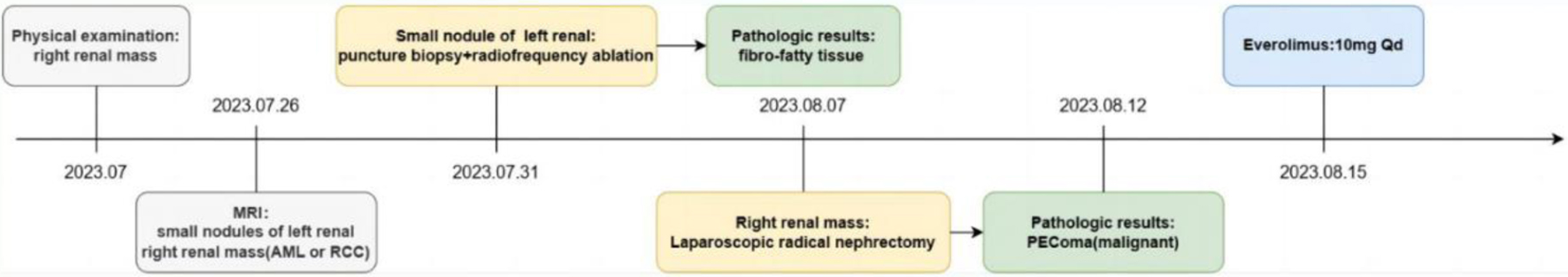 Postoperative pathological examination revealed that the right renal mass was PEComa. This diagnosis was characterized by a predominance of atypical epithelioid cells, significant nuclear atypia exceeding 2/10 HPF, pathological mitotic figures, focal tumor necrosis, and vascular invasion. Immunohistochemical analysis showed positive staining for HMB45, melan-A, and PNL2, but negative for desmin, S100, and TFE3, further supporting the PEComas diagnosis (Fig. 3). The final diagnosis of malignant PEComa in the right kidney was established based on these histological and immunohistochemical findings. Postoperatively, the patient recovered well without major complications such as severe bleeding, infection, renal insufficiency, or urinary leakage. A flowchart of the patient’s main treatment events is shown in Figure 4. The patient presented solely with a one-sided renal mass identified as PEComas, while the opposite renal mass was not renal PEComas, and no additional irregularities were found in the physical exam or supplementary examination, failing to align with the clinical diagnostic criteria of TSC [74]. Post-surgery, our recommendation was for the patient to try a genetic screening for TSC-related mutations, yet the patient declined any additional genetic testing for personal reasons. The instructions were given for the patient to consume everolimus by oral, and the subsequent check-up period has spanned roughly 7 months, currently free from any clear adverse effects, and the tumor did not recur metastatically in the chest and abdominal CT scans.