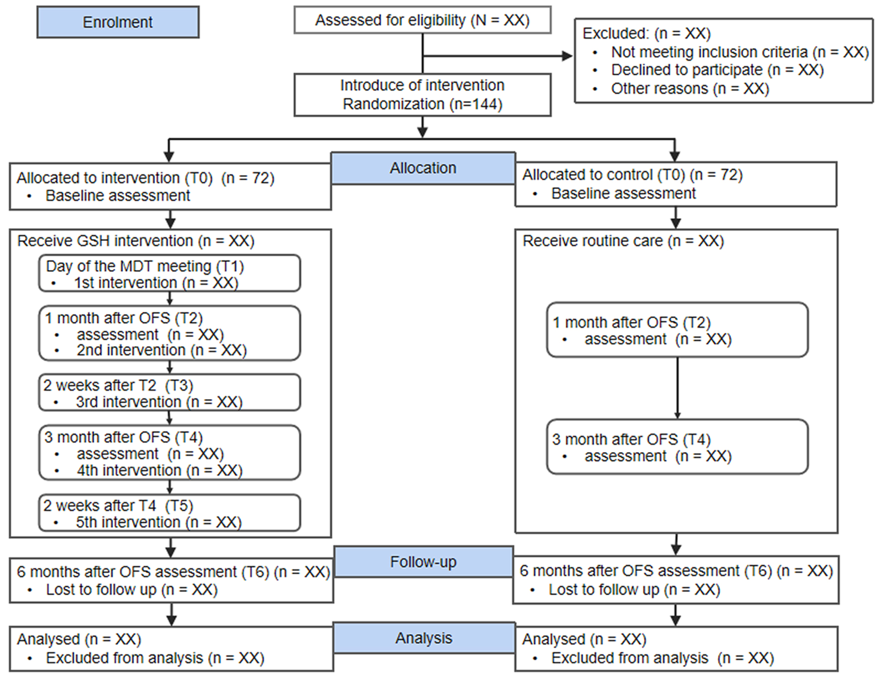 This study will be a single-blind, double-arm, randomized controlled trial to evaluate the effectiveness of the GSH program (Fig. 2). On the multidisciplinary treatment (MDT) meeting day, healthcare routinely informs patients of adjuvant treatment modalities, so it is possible to determine whether the patient will be undergoing OFS therapy. Researchers randomly assigned eligible patients who agreed to participate to either the GSH group (intervention group) or the usual nursing care group (control group) on the MDT meeting day and then gave the appropriate intervention on the same day. The intervention is carried out in five sessions over at least 15 weeks. The primary outcome (symptom burden) and secondary outcomes (quality of life, hope, and social support) will be investigated at four time points: the MDT meeting day (immediately after participant recruitment), 1, 3, and 6 months after OFS (Fig. 3).