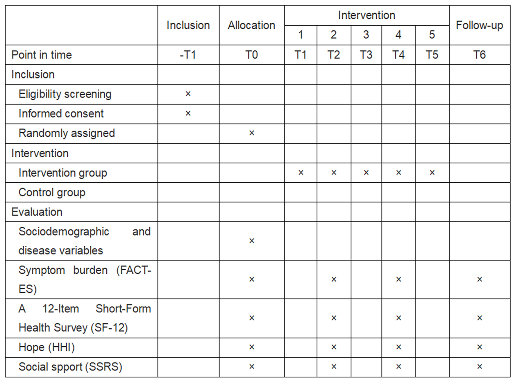 Researchers trained in statistical analyses will assess participants’ intervention outcomes, including demographics, disease characteristic variables, symptom burden, and other variables. Demographics, disease characteristic variables, symptom burden, quality of life, social support, and level of hope are collected at baseline. The relevant data are collected at four time points: baseline (T0), 1 month (T1), 3 months (T4), and 6 months (T6) after OFS treatment.