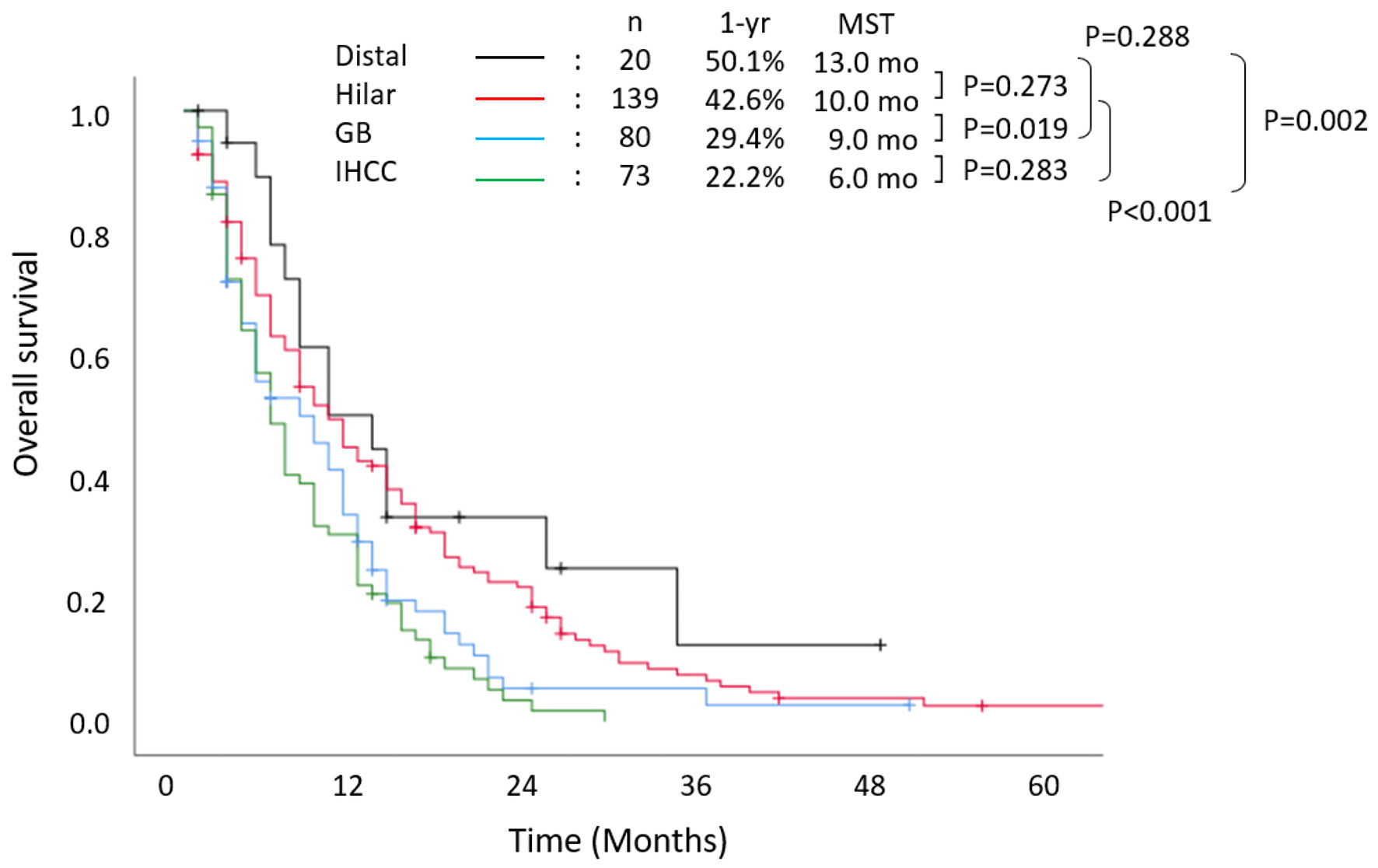 ![]() Click for large image | Figure 1. Overall survival stratified according to primary tumor location. MST: median survival time; IHCC: intrahepatic cholangiocarcinoma; GB: gallbladder cancer; yr: year; mo: months. |