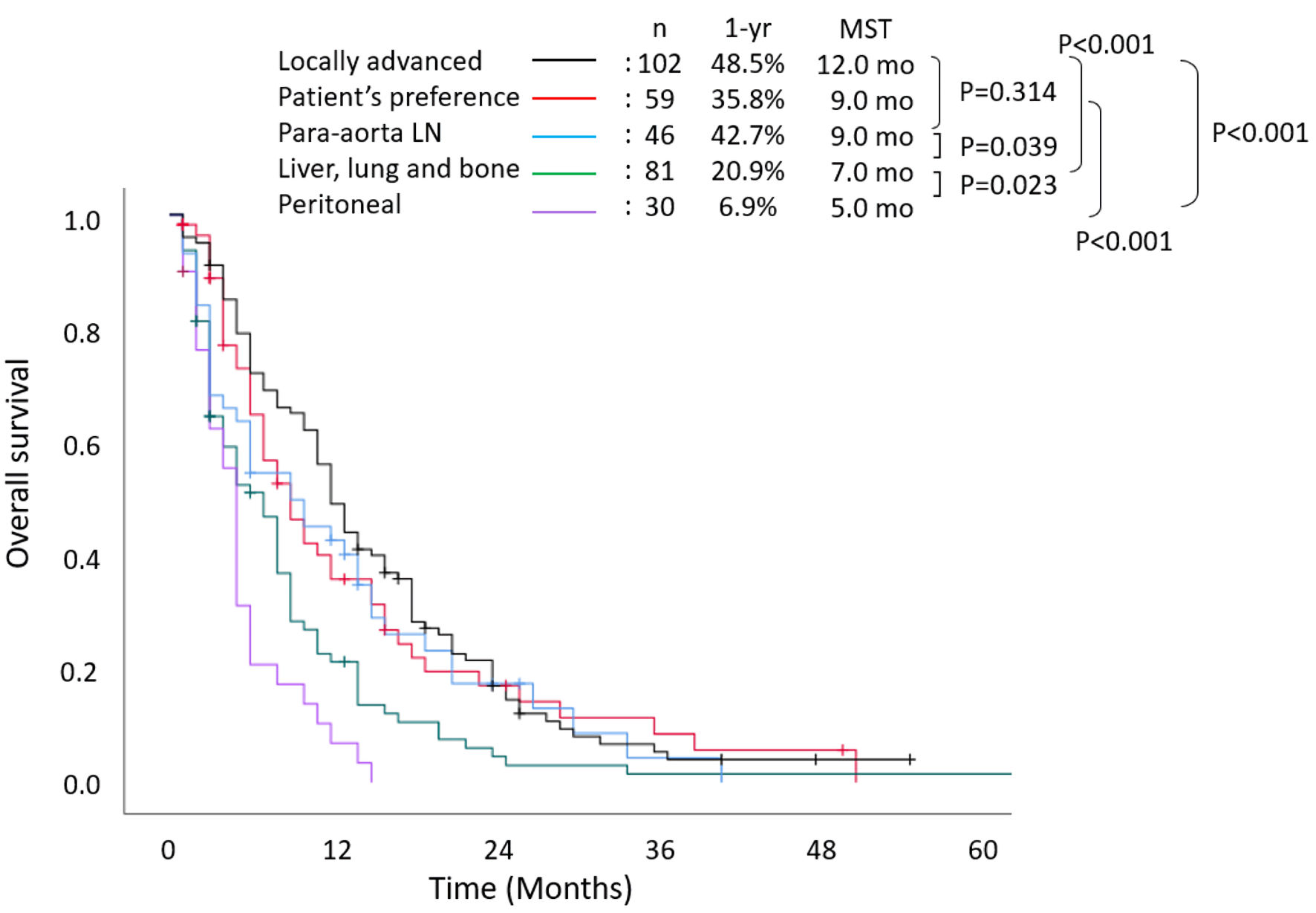 ![]() Click for large image | Figure 2. Overall survival stratified according to reason for unresectability. MST: median survival time; LN: lymph node; yr: year; mo: months. |
