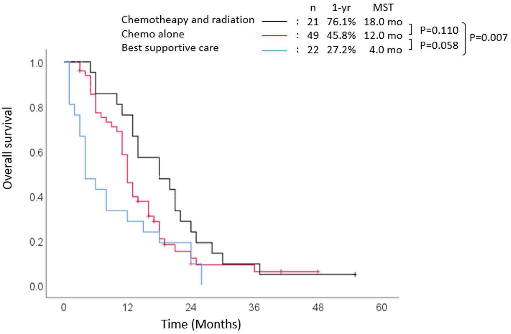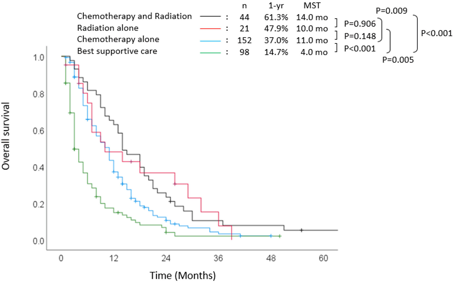 ![]() Click for large image | Figure 3. Overall survival stratified according to treatment. MST: median survival time; yr: year; mo: months. |