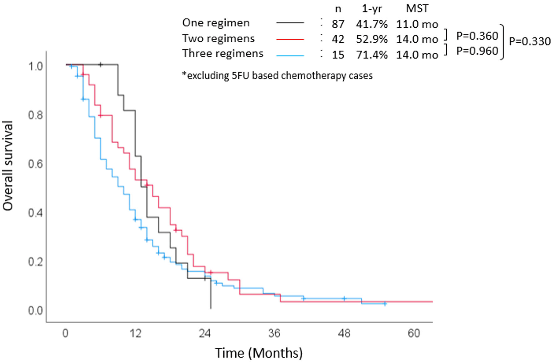 ![]() Click for large image | Figure 4. Overall survival stratified according to number of regimens. MST: median survival time; yr: year; mo: months; 5-FU: 5-fluorouracil. |