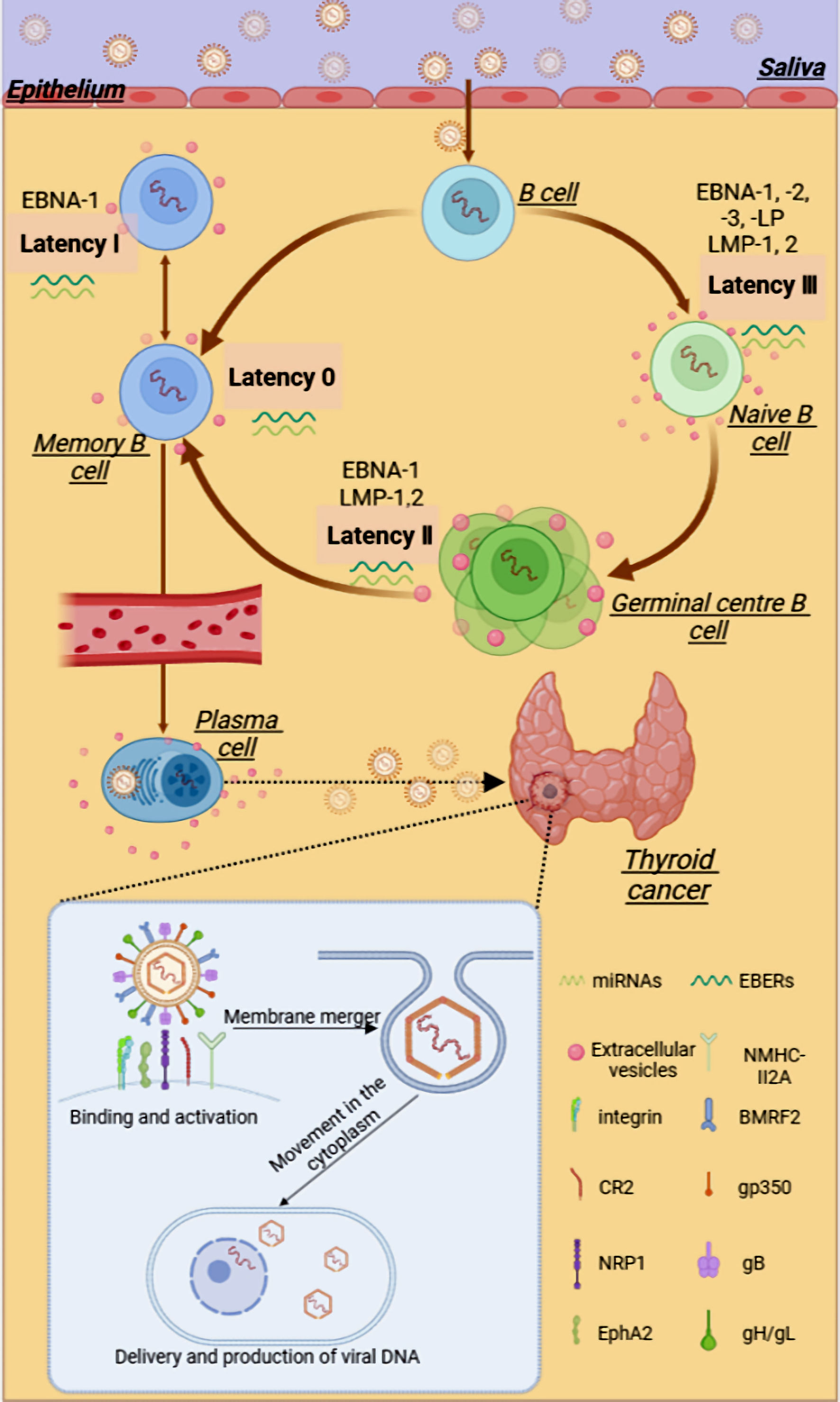 ![]() Click for large image | Figure 1. The possible relationship between EBV and thyroid cancer. EBV can be transmitted through saliva, passing through the oropharyngeal epithelium and tonsils, infecting lymphoid B cells, and subsequently infecting the initial B cells. After a complex series of latent infections, EBV may enter thyroid tissue through the blood circulation or lymphatic system. EBV can package various viral products, such as viral proteins and RNAs, into the extracellular vesicles to aid in the evasion of the host immune system and promote tumor progression within the TME. In the presence of multiple viral glycoproteins, EBV binds and activates receptors on cells, invading and proliferating within thyroid cells. gB: glycoprotein B; gH: glycoprotein H; gL: glycoprotein L; NRP1: neuropilin 1; EphA2: ephrin receptor A2; EBV: Epstein-Barr virus; EBNA1: Epstein-Barr virus nuclear antigen 1; EBER: EBV-encoded RNA; CR2 or CD21: complement receptor type 2; LMP: latent membrane protein; miRNA: microRNA. |