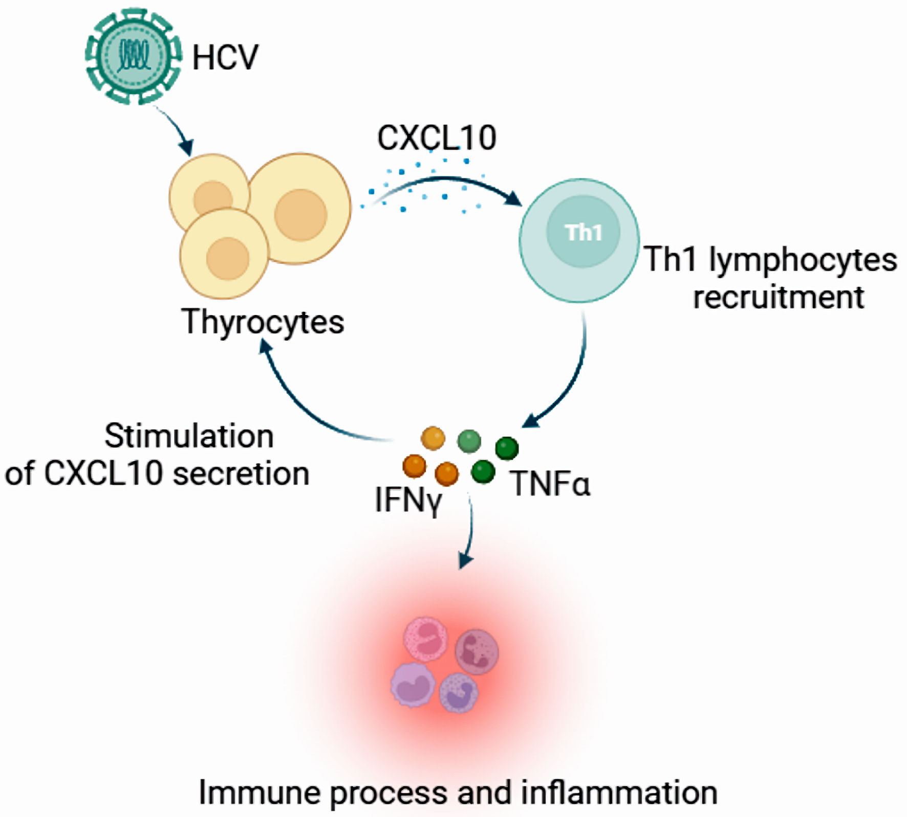 Meanwhile, it was noted that the interaction of HCV core protein with gC1qR could induce macrophages to secrete C-X-C motif chemotactic factor 10 (CXCL10) through the NF-κB signaling pathway [55]. Chronic HCV infection may upregulate CXCL10 expression and secretion in infected thyrocytes recruiting Th1 lymphocytes, which may be responsible for enhanced IFN-γ and TNF-α production, inducing a further CXCL10 secretion by a variety of cells and creating an amplification feedback loop which initiates and perpetuates the immune cascade, and results in the appearance of AITDs in genetically predisposed subjects (Fig. 2) [56, 57]. We can study the mechanism of chemokines and cytokines in the pathogenesis of autoimmune diseases, and further experiments need to explore whether CXCL10 can be used as a new therapeutic target for thyroid autoimmune disease.
