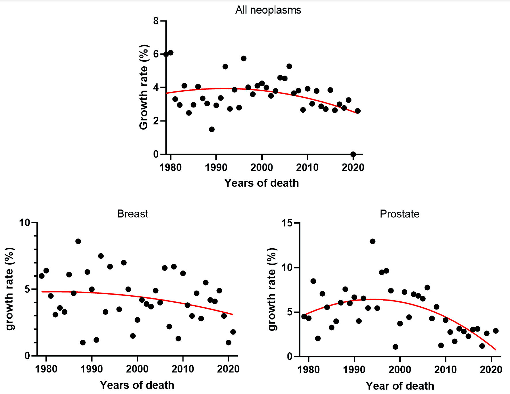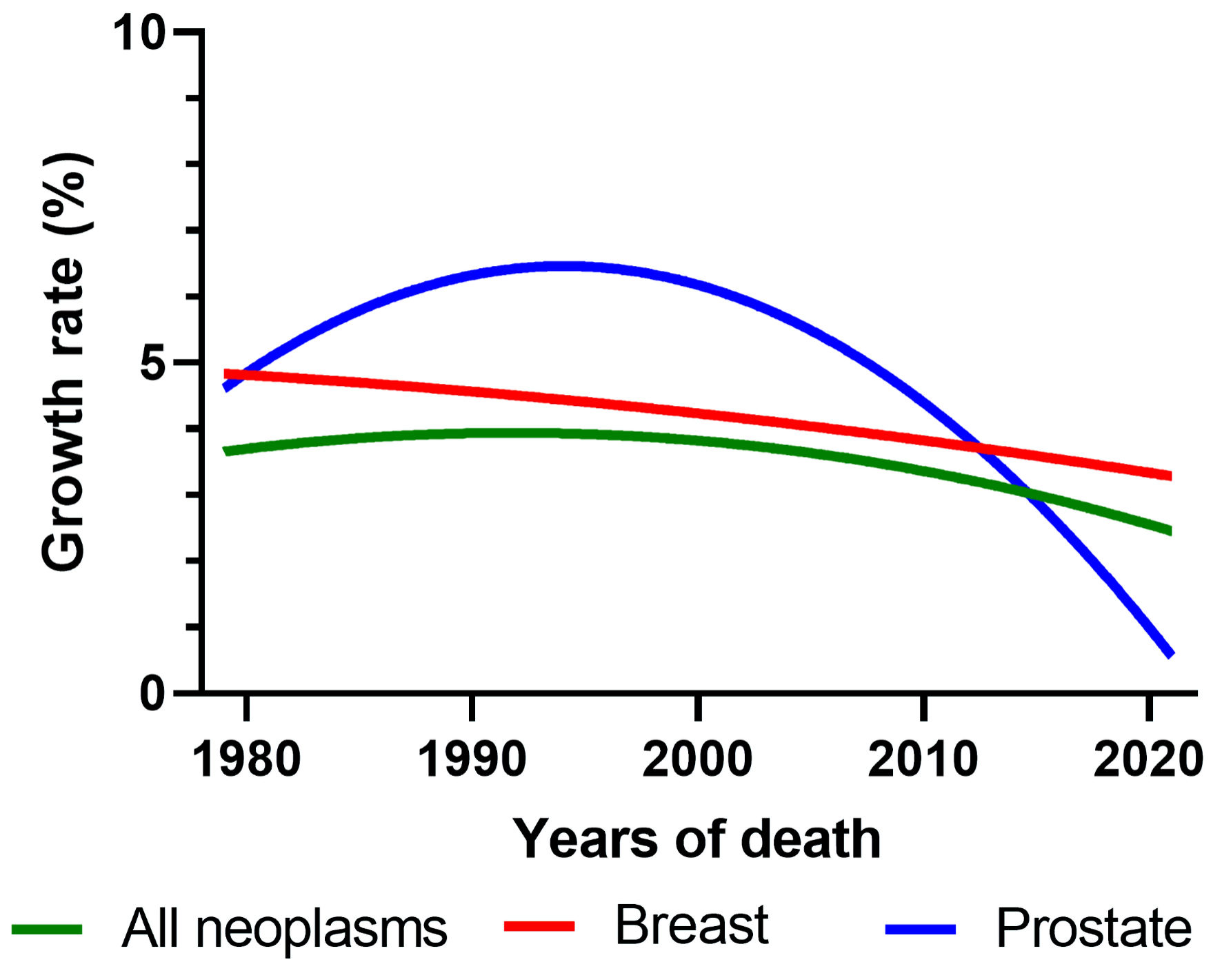 Keywords: Cancer mortality trends; Breast cancer; Prostate cancer; Public health policy; Mortality information system; Growth rate analysis