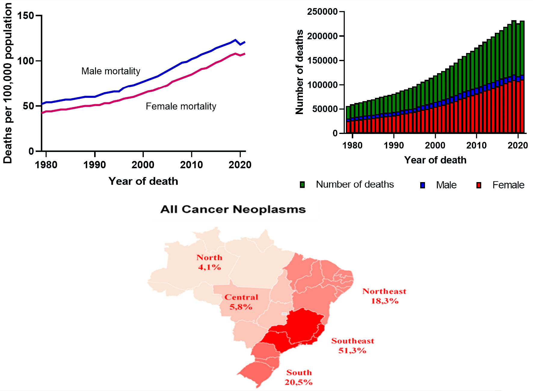 ![]() Click for large image | Figure 2. Cancer mortality rates and the distribution of cancer deaths by gender in Brazil, spanning from 1979 to 2021, along with the percentage distribution of these deaths across the five regions. |