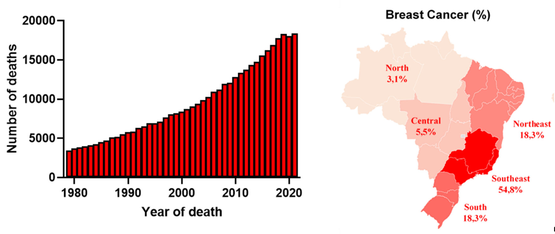 ![]() Click for large image | Figure 3. Total deaths from breast cancer in Brazil, along with the percentage distribution of these deaths across the five regions. |