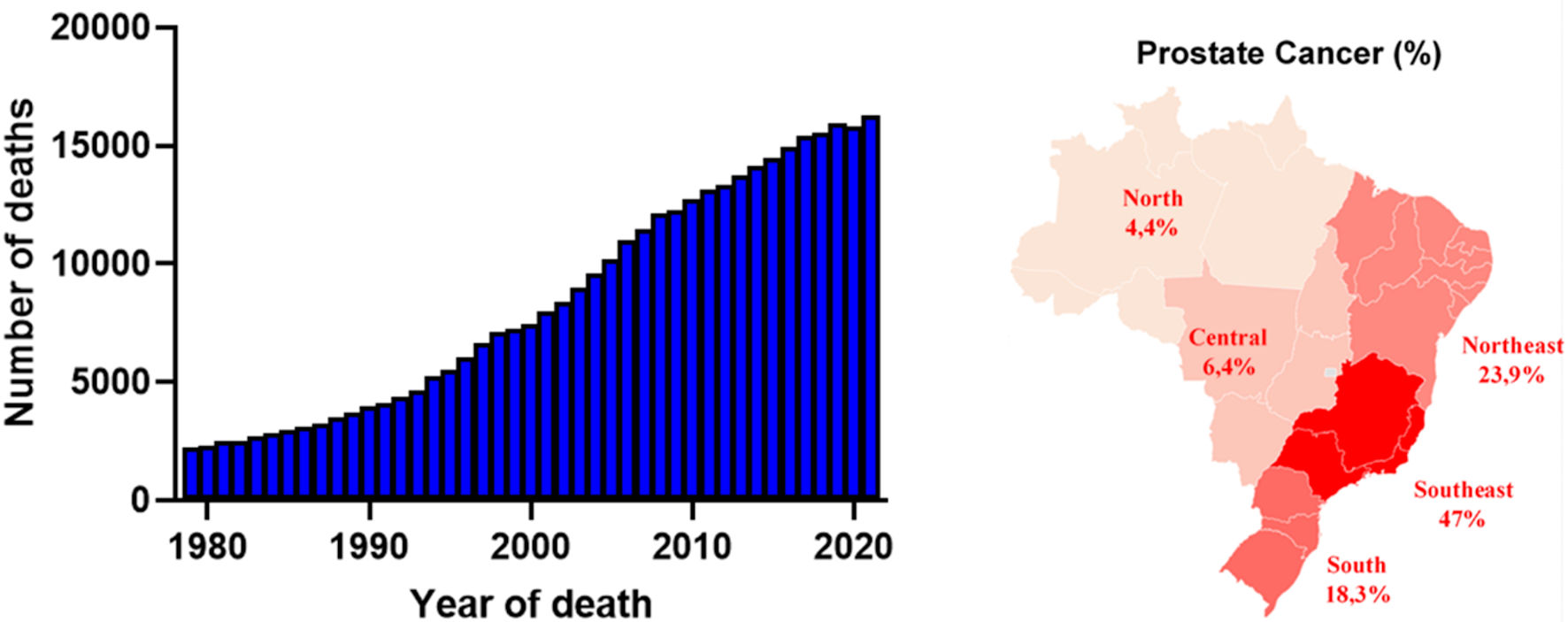 During this period, approximately 12% of male deaths in Brazil were due to malignant cancer neoplasms, with an average of 6% occurring due to prostate cancer. Since 1979, 362,079 male deaths from this disease have been recorded, with an average growth rate until 2021 of 4.9% per year.