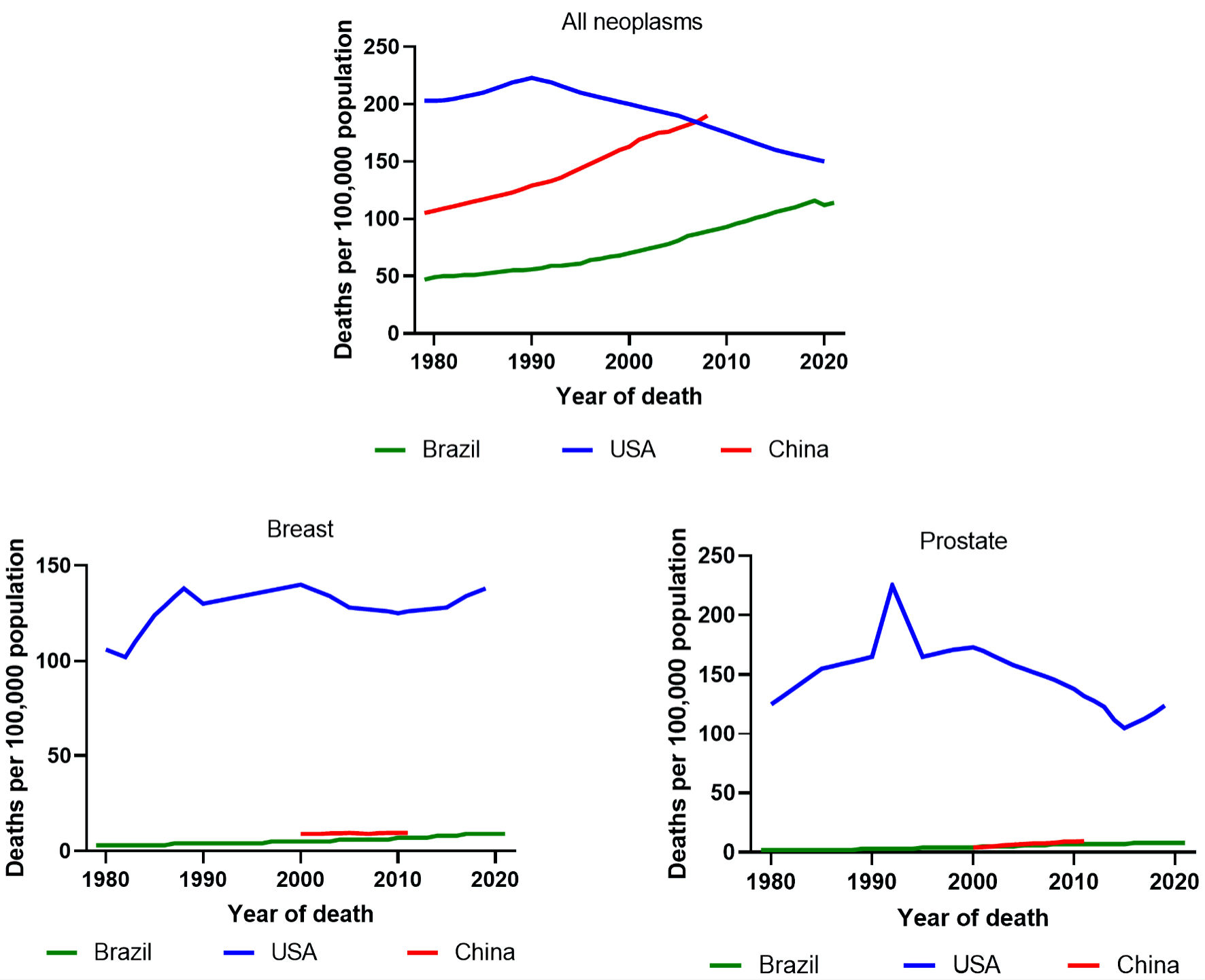 ![]() Click for large image | Figure 5. The trends in cancer mortality rates in the USA (1979 - 2019), China (1990 - 2019), and Brazil (1979 - 2021) for all neoplasms, with a specific focus on breast and prostate cancer. |