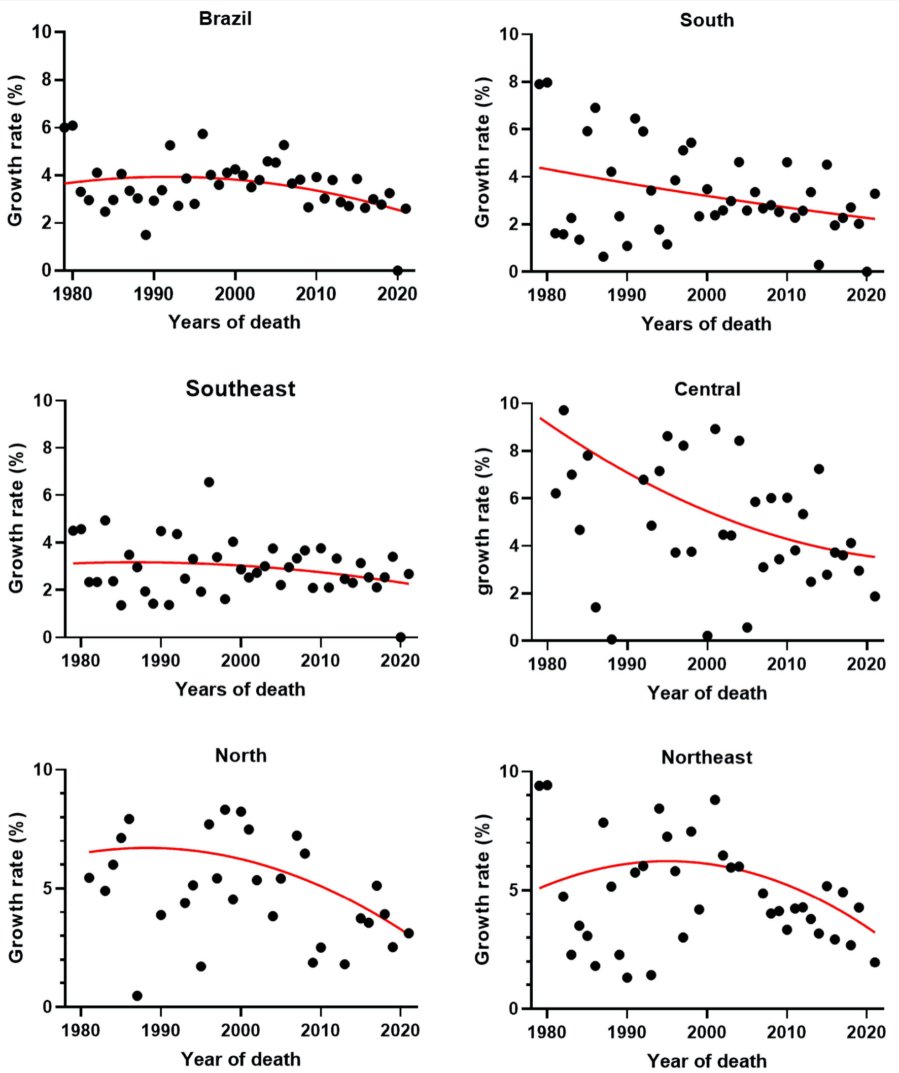![]() Click for large image | Figure 7. Comparison between the growth rates of cancer deaths in Brazil and its geographic regions. |