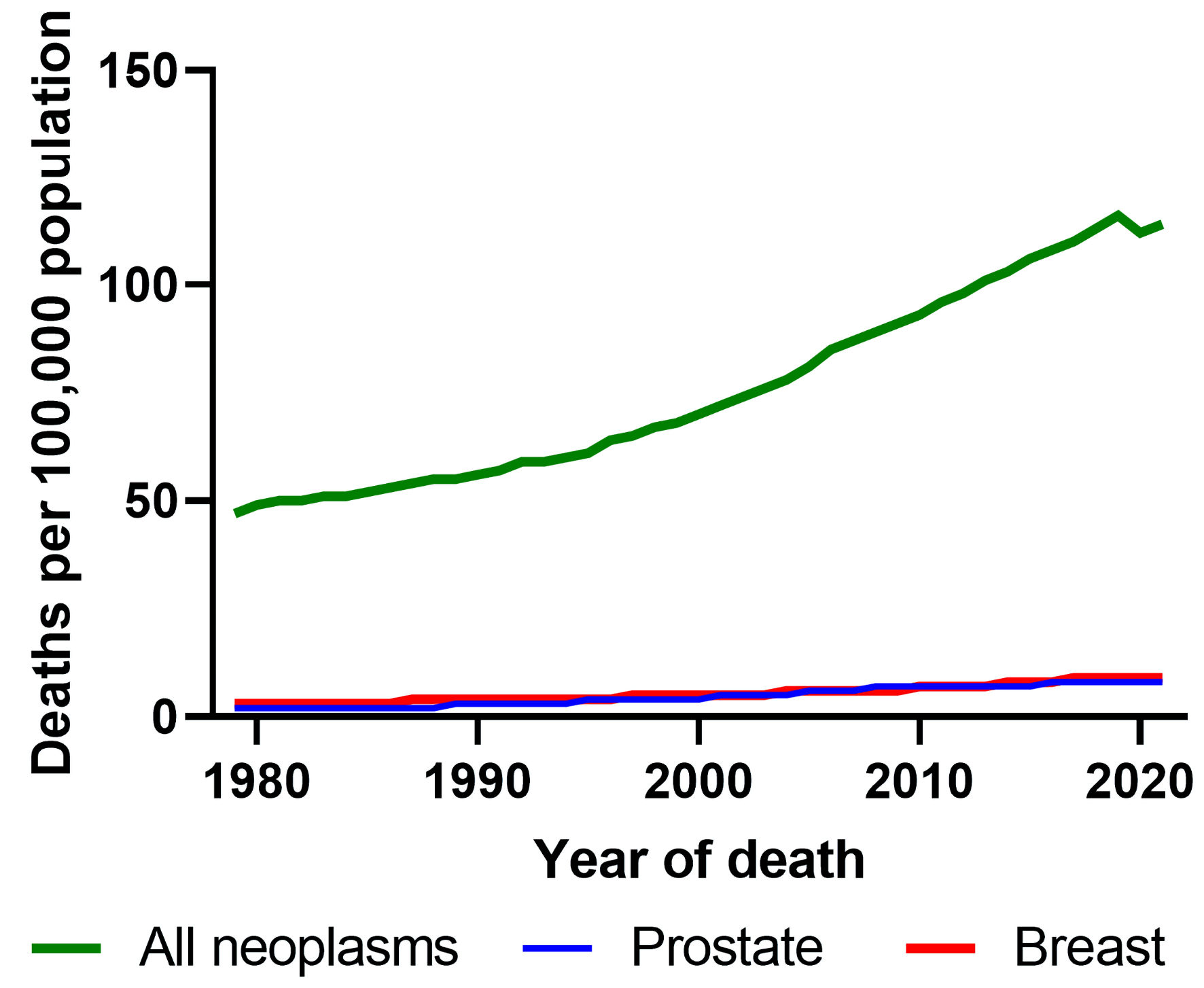 Background: This study examined cancer mortality trends in Brazil from 1979 to 2021, emphasizing breast and prostate cancers.