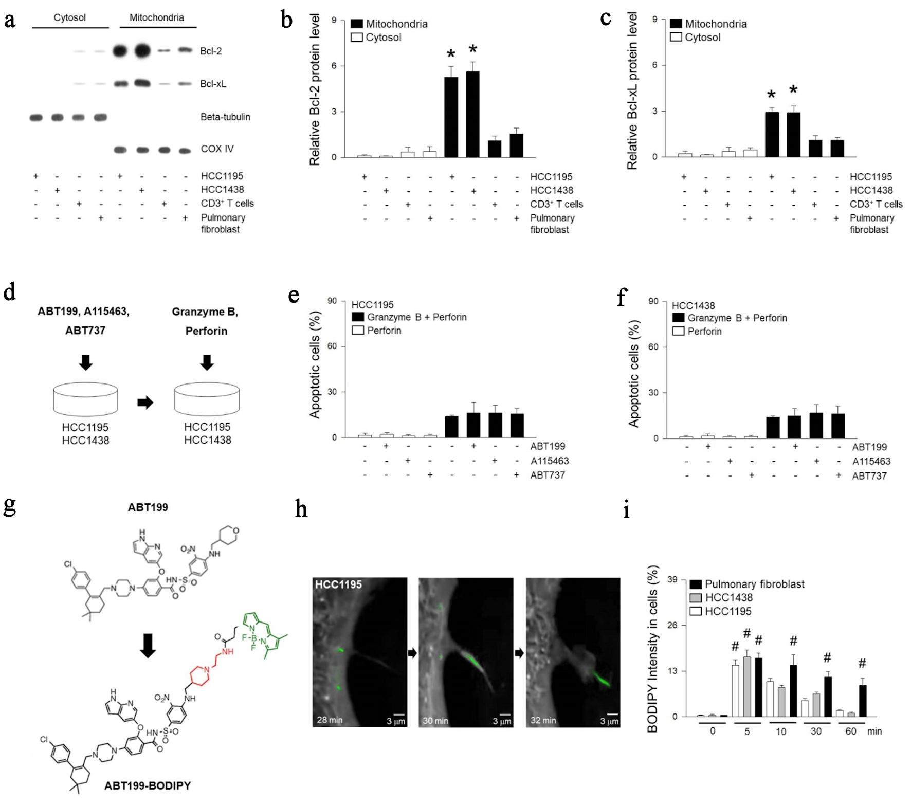 Bcl-2 and Bcl-xL have been known to be highly expressed in pulmonary tumor cells [31]. They are more predominantly concentrated in mitochondria compared to the cytosol in HCC1195 or HCC1438 lung tumor cell lines (Fig. 1a-c). To block Bcl-2 and Bcl-xL, BH3-mimetics such as ABT199, A115463, and ABT737 were used (Fig. 1d-f). ABT199 is a selective Bcl-2 inhibitor, while A115463 is designed to inhibit Bcl-xL, and ABT737 inhibits both Bcl-2 and Bcl-xL [32, 33]. HCC1195 or HCC1438 cell lines were treated with BH3-mimetics, but no significant tumor cell death was observed. To induced additional cell death, they were co-treated with granzyme B and perforin. Treatment with granzyme B and perforin resulted in 16% induction of cell death, but BH3-mimetics did not show any additional tumor cell death. Treatment with BH3-mimetics at a three-fold higher concentration induced approximately 20% of the tumor cell death (Supplementary Material 1, www.wjon.org). However, it also resulted in 30% cell death in pulmonary fibroblasts. This was considered to be due to the toxicity of the chemical substance itself rather than the tumoricidal effects of BH3-mimetics. To track BH3-mimetics in tumor cells, BODIPY was attached to ABT199 (Fig. 1g) [30]. After treatment of ABT199-BODIPY in HCC1195 cells, cells were monitored using a tomographic microscopy (Fig. 1h, i). This process was scanned with a λ = 520 nm, and the holographic images were subsequently recorded. Intriguingly, ABT199 remained intracellularly for 1 h in pulmonary fibroblasts, whereas about half of them disappeared within 15 min, and a negligible concentration was present intracellularly within 1 h in HCC1195 or HCC1438 cells. In summary, we found that the poor antitumor activity of BH3-mimetics was likely due to their quick elimination from HCC1195 or HCC1438 cells.