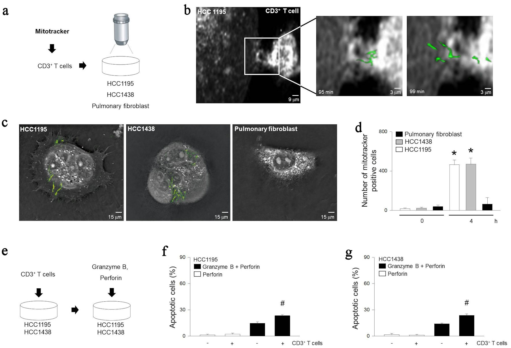 It has been reported that various tumor cells hijack mitochondria from non-activated T cells [34]. Non-activated T cells were stained with mitotracker and cultured together with HCC1195, HCC1438 or pulmonary fibroblasts (Fig. 2a, b). Using tomographic microscopy, we observed that HCC1195 hijacked mitochondria of T cells. Using fluorescence microscopy, we confirmed that the stained mitochondria of the immune cells migrated to HCC1195 or HCC1438 (Fig. 2c, d). This appeared to be specific to tumor cells, as pulmonary fibroblasts did not show any significant mitochondrial migration. The mitochondrial movement itself did not affect apoptosis. However, the mitochondrial transfer promoted granzyme B-mediated cell death of the pulmonary tumor cells (Fig. 2e-g).