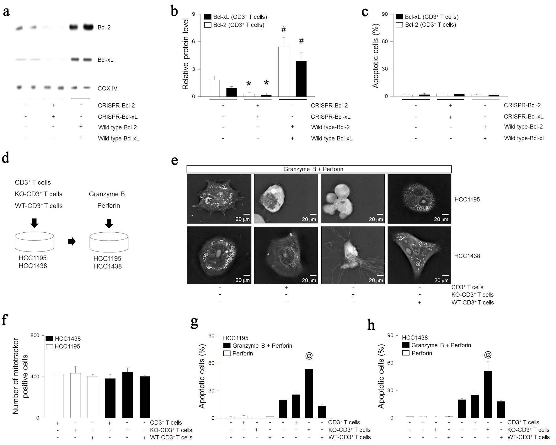 Human lung cancer lines, HCC1195 (ATCC; RRID: CVCL_5127) or HCC1438 (ATCC; RRID: CVCL_L088) were maintained in Roswell Park Memorial Institute Medium 1640 (RPMI 1640) (11875093, Thermofisher, USA) with 10% bovine serum (16000044, Gibco, USA) at 37 °C under an atmosphere of 95% O2 and 5% CO2. The cells were treated with ABT199 (3 nM, 6960, Tocris, UK), A115463 (19 nM, S7800, Selleck Chemicals, USA), or ABT737 (15 µM, 6835, Tocris, UK) for 1 h. Apoptosis was induced following combinations of recombinant perforin (100 pg/µL, ENZ-PRT313-0010, Enzo Life Science, USA) and granzyme B (200 pg/µL, 10345-H08H, Sinobiological, China). CaCl2 (1.25 mM) was added for perforin activity. Human CD3+ T cells (PB03020C, StemExpress, USA) were obtained through the protocol number 401-01 and the IRB tracking number 20152869. T cells were cultured in AIM V medium (12055091, Thermo Fisher Scientific, USA), supplemented with 10% fetal calf serum (A3520502, Thermo Fisher Scientific, USA). Human pulmonary fibroblast (C-12360, PromoCell, Germany) were cultured in fibroblast growth medium 2 (C-23020, PromoCell, Germany).
