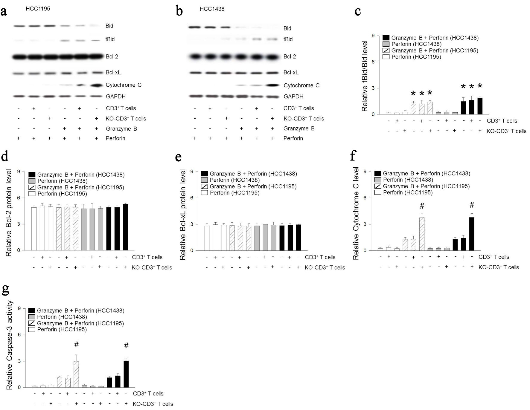 We observed BH3 interacting domain death agonist (Bid) was truncated (tBid) in both HCC1195 and HCC1438 following granzyme B treatment (Fig. 4a-c). The entry of Bcl-2 and Bcl-xL KO mitochondria did not alter the total amount of Bcl-2 and Bcl-xL proteins in HCC1195 and HCC1438 cells (Fig. 4d, e). However, infiltration of Bcl-2 and Bcl-xL KO mitochondria with granzyme B led to increase cytochrome C in cytosol and caspase-3 activity in HCC1195 and HCC1438 cells (Fig. 4f, g).