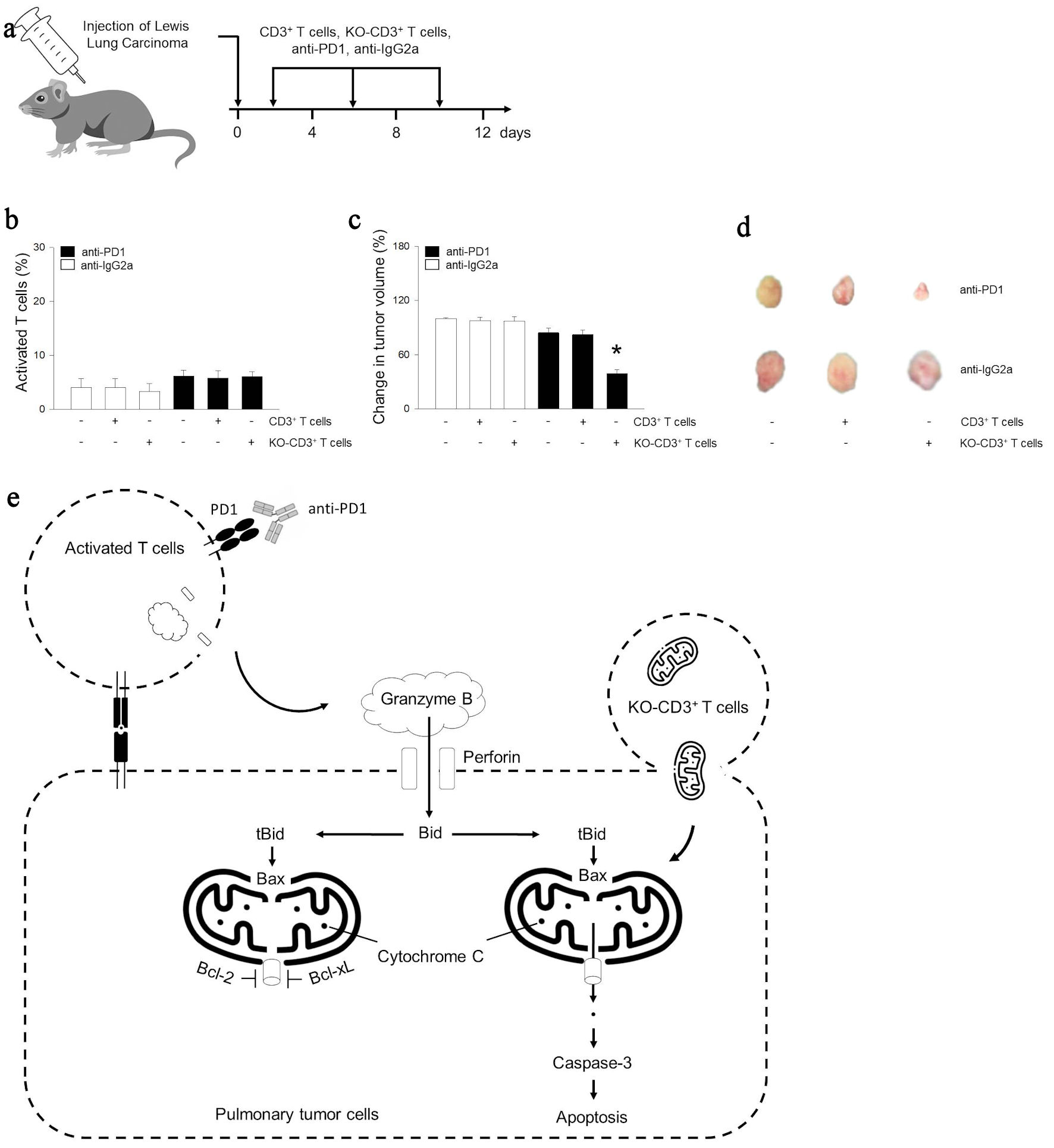 To test for mitochondrial hijack by cancer cells in vivo, we injected Lewis lung carcinoma cells into C57BL/6 mice (Fig. 5a). After 8 days, we injected T cells or anti-PD-1 for 12 days. Anti-PD-1 injection did not alter the proportion of activated T cells (Fig. 5b). T cells or KO T cells treatment did not show change in tumor volume (Fig. 5c, d). In contrast, anti-PD-1 reduced tumor volume by 13%. Moreover, KO T cell treatment with anti-PD-1 induced an additional 28% reduction in tumor volume. In summary, migration of Bcl-2 and Bcl-xL KO mitochondria resulted in potentiation of tumoricidal effects of activated T cells (Fig. 5e).