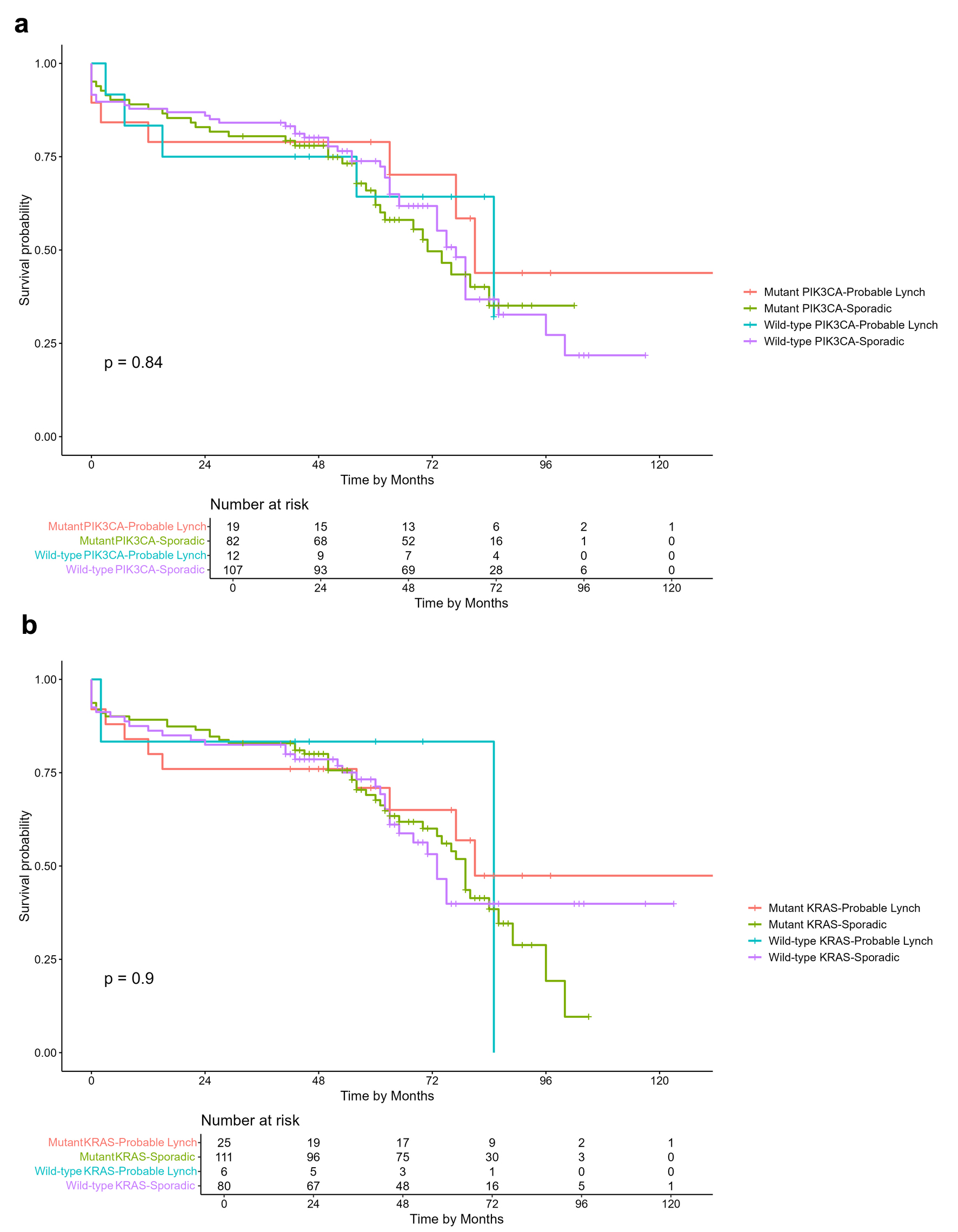 We analyzed the overall survival based on KRAS and PIK3CA mutations stratified by LS status. The numbers of samples that met the criteria for this analysis on PIK3CA and KRAS mutation are 220 and 222, respectively. There were no statistically significant differences of overall survival (follow-up period of 120 month) based on KRAS and PIK3CA mutation with probable Lynch and non-Lynch status patient (Fig. 1). Additionally, we conducted an overall survival analysis considering PIK3CA and KRAS mutations stratified by MSI status (Supplementary Material 1, www.wjon.org), comparing PIK3CA and KRAS mutant versus wild-type cases (Supplementary Material 2, www.wjon.org), and differentiating probable Lynch from sporadic cases (Supplementary Material 3, www.wjon.org). None of these analyses yielded statistically significant results.