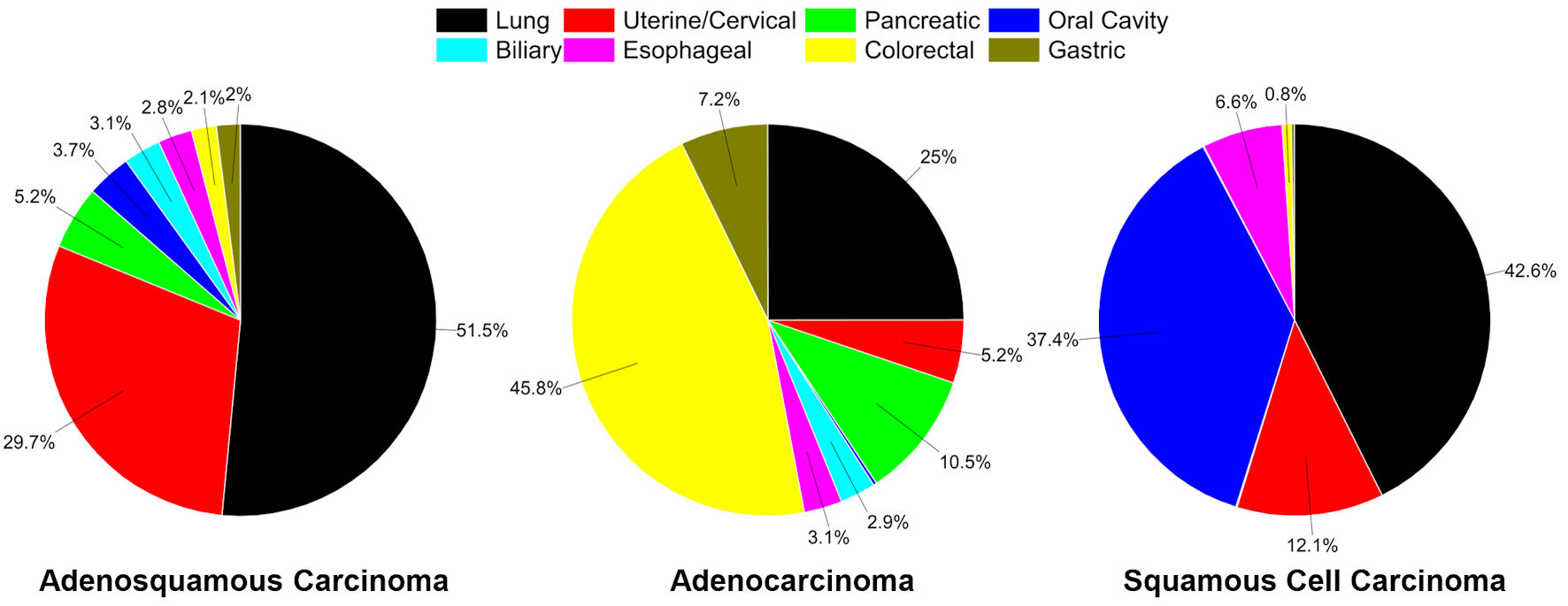 ![]() Click for large image | Figure 1. Distribution of cancers in SEER, 1975 - 2020 for sites analyzed. Distribution of adenosquamous carcinoma cases in all major sites examined (total of 26,525 cases (92.7% of all adenosquamous carcinoma cases in SEER)) (left). Distribution of all conventional adenocarcinoma cases in sites examined (total of 1,535,527 cases) (middle). Distribution of all conventional squamous cell carcinoma cases in sites examined (total of 588,802 cases) (right). |