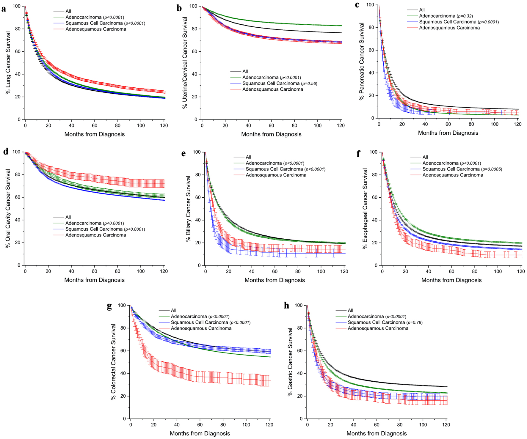 Results: Lung ASCs comprise 51.5% of all ASC cases, accounting for 1.1% of all lung cancer cases, followed by uterine/cervical cancers at 29.7% of all ASC cases, translating into 1.8% of all cancers in this site. In descending order, the remaining 20% of ASCs arise in pancreatic, oral cavity, biliary, esophageal, colorectal, and gastric sites, comprising between 0.1% and 0.7% of all cancers in these sites. Apart from pancreatic and oral cavity cancers, ASC tumors tended to favor higher rates of regional or distant disease at presentation with poor tumor differentiation compared to either AC or SCC histologies. After multivariable analysis, adjusting for age, sex, detection stage, grade differentiation, surgery, chemotherapy, and radiotherapy, except for oral cavity cancers, ASCs tended to have worse overall survivals compared to ACs (hazard ratios: 1.1 - 1.6) and SCC (1.0 - 1.3), with colorectal ASCs having the worse overall survival compared to colorectal ACs, with a hazard ratio of 1.4 (95% confidence interval: 1.3 - 1.6).