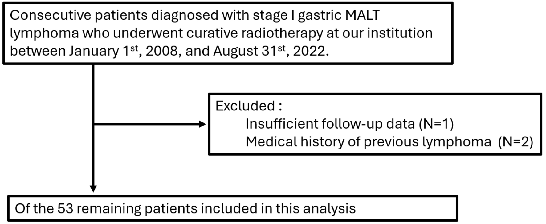 This study adhered to the guidelines approved by the institutional review board of our hospital (number: 3372-6). This retrospective cohort study complied with the ethical principles outlined in the Helsinki Declaration. Clinical staging followed the Lugano Modification of the Ann Arbor Staging System [10], involving physical examination, contrast-enhanced computed tomography (CT), endoscopic procedures, 18F-fluorodeoxyglucose-positron emission tomography, and/or bone marrow biopsy. We included consecutive patients diagnosed with stage I gastric MALT lymphoma who underwent curative radiotherapy at our institution between January 1, 2008 and August 31, 2022, who met the following criteria: histologically confirmed MALT, completed curative intent radiotherapy, absence of distant metastasis, and no history of prior stomach radiotherapy. The exclusion criteria were insufficient follow-up data and a medical history of previous lymphoma. Medical follow-up encompassed medical history, physical examination, and imaging studies, with endoscopic biopsies typically conducted annually. Adverse events related to radiotherapy were assessed retrospectively through medical record review. Acute and late adverse events were graded according to the National Cancer Institute Common Toxicity Criteria for Adverse Events version 5.0.