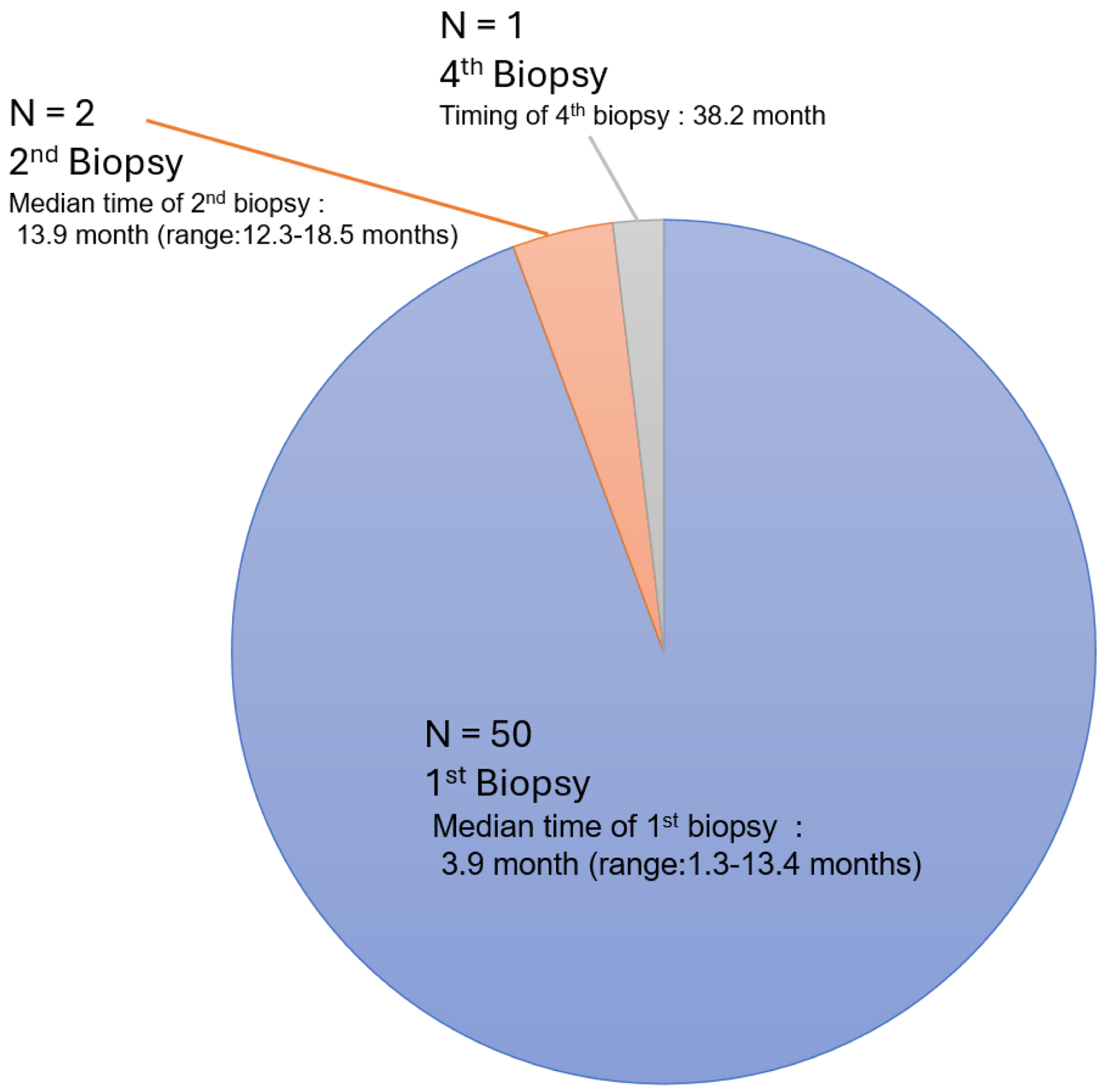 At the time of the second biopsy, conducted at a median of 13.9 months (range: 12.3 - 18.5 months) after radiotherapy, CR was confirmed in two out of the remaining three patients. The third biopsy, performed 26.8 months after radiotherapy in the remaining patient, did not show CR. The fourth biopsy, conducted 38.2 months after radiotherapy, confirmed CR in the last remaining patient (Fig. 2).