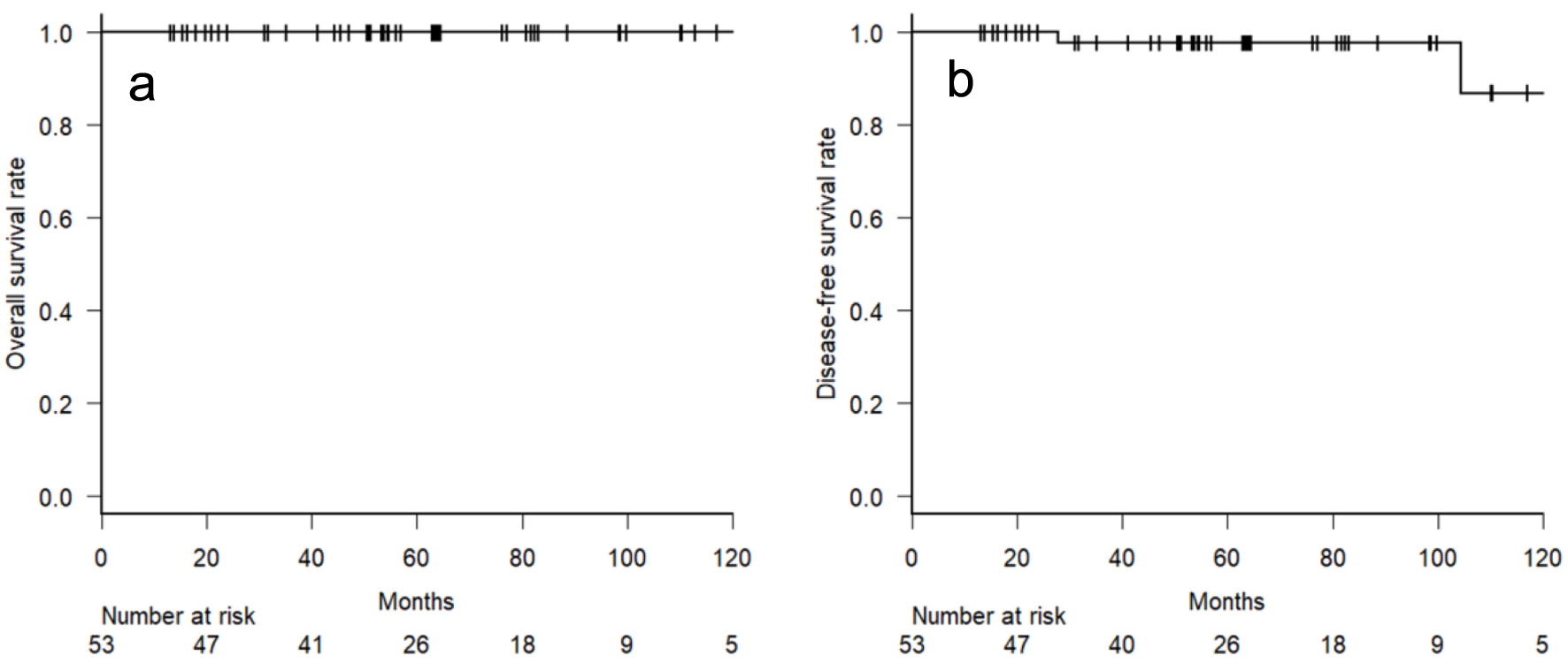 ![]() Click for large image | Figure 3. Kaplan-Meier curve of overall survival (a) and disease-free survival (b) rates. |
