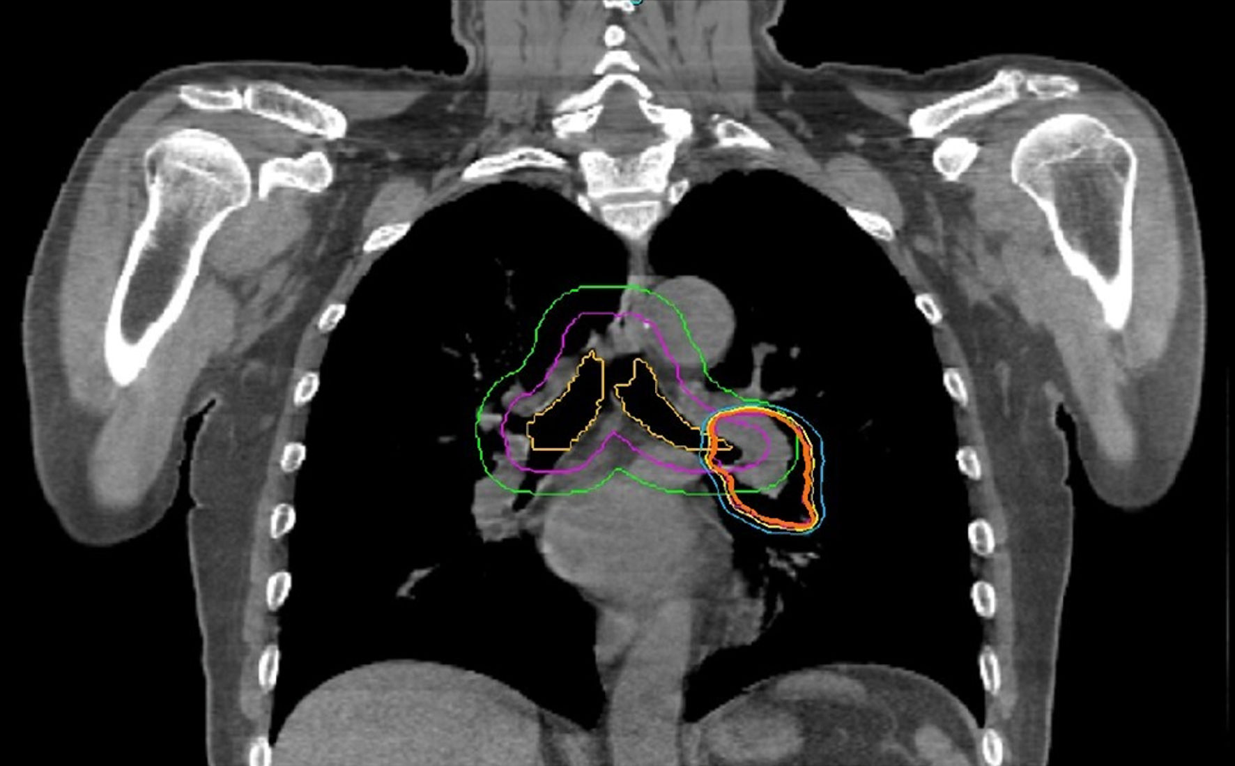 ![]() Click for large image | Figure 1. Organ at risk and isodose distribution in a case with centrally located primary lung lesion |